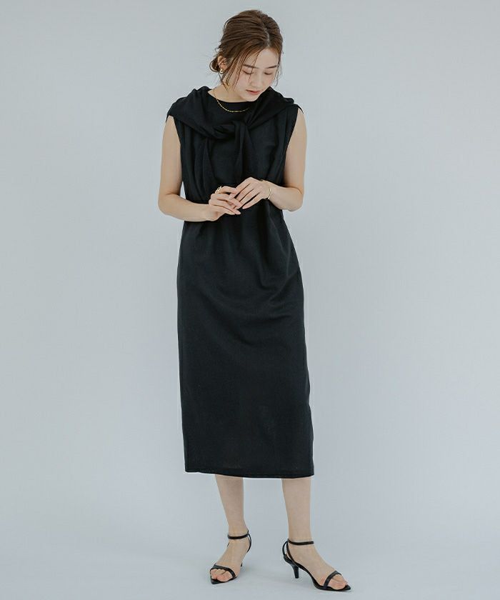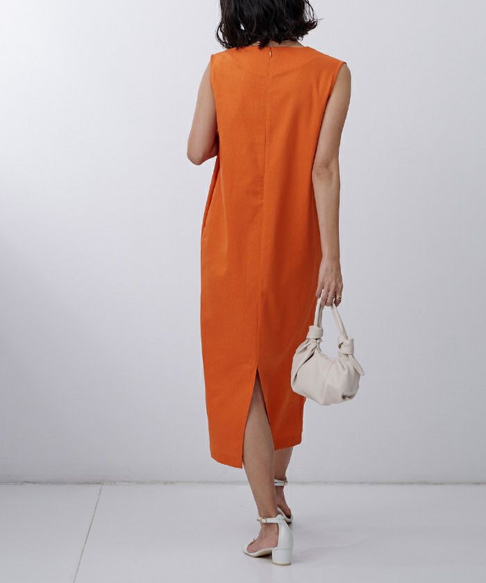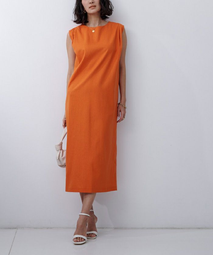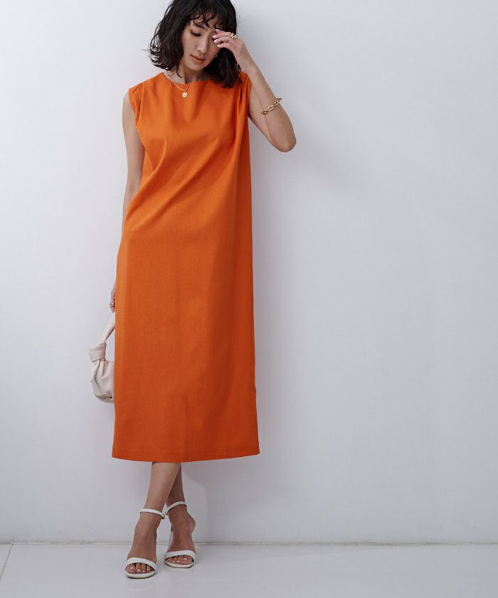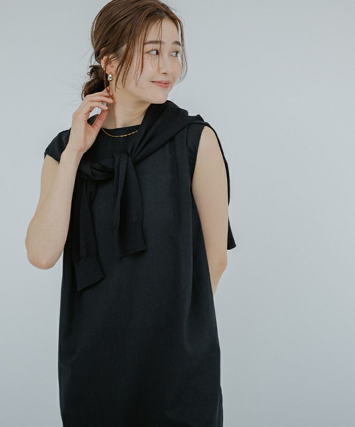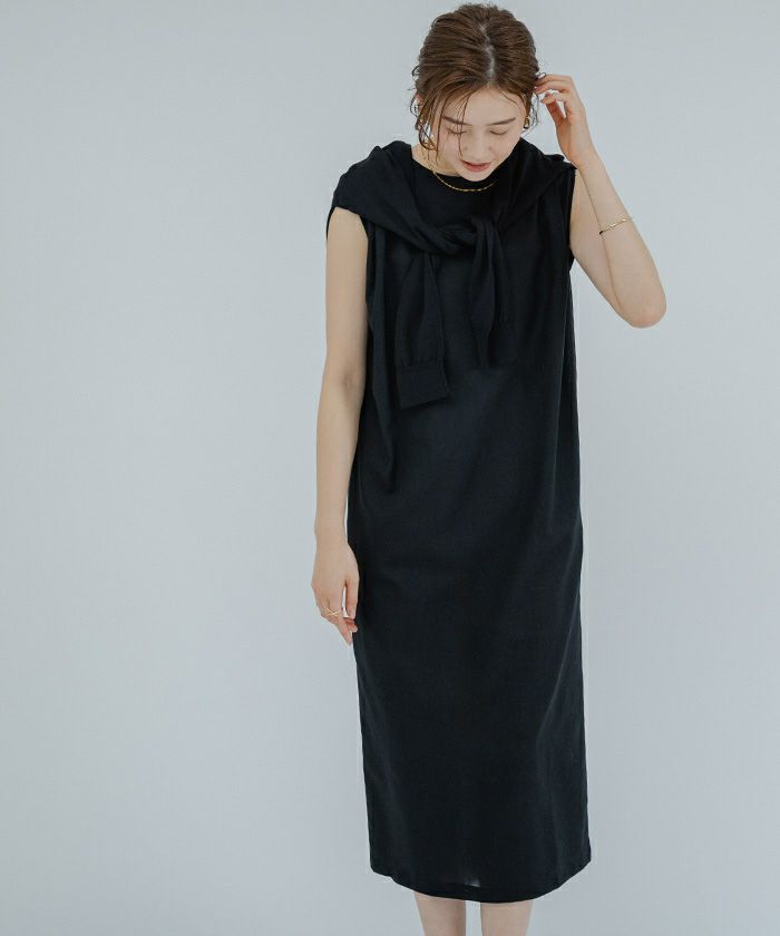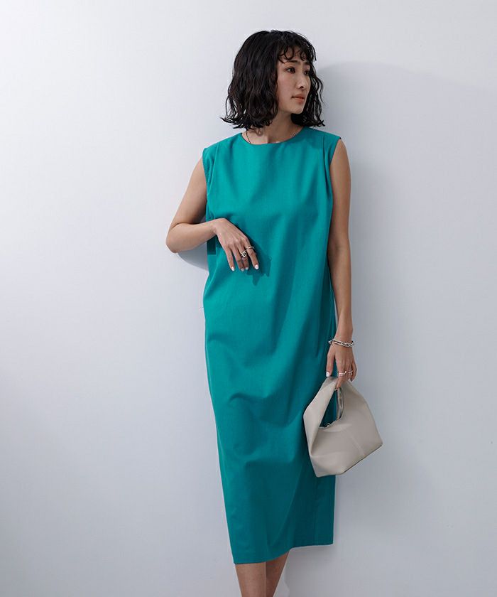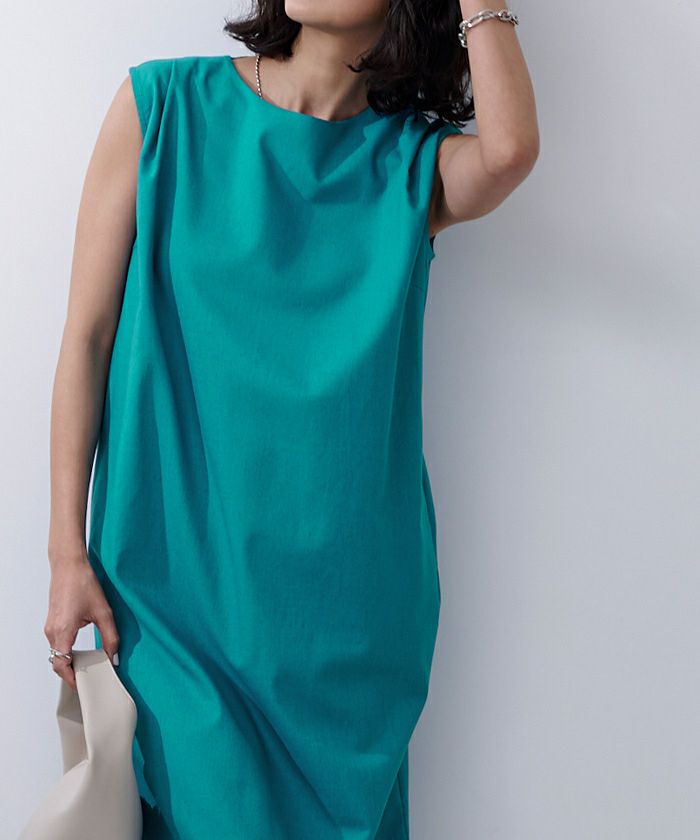 身体のラインを拾い過ぎないコクーンシルエットのノースリーブワンピース。