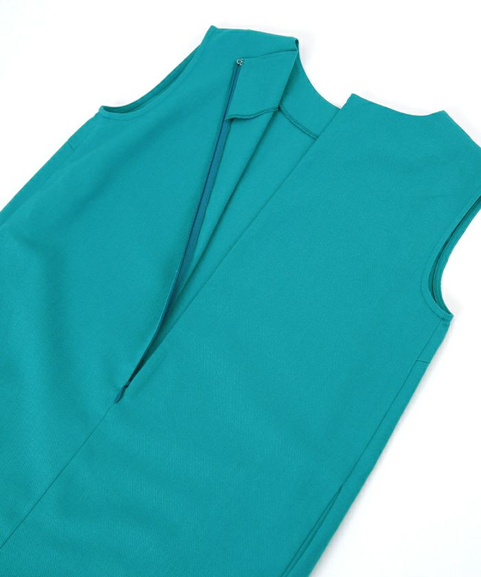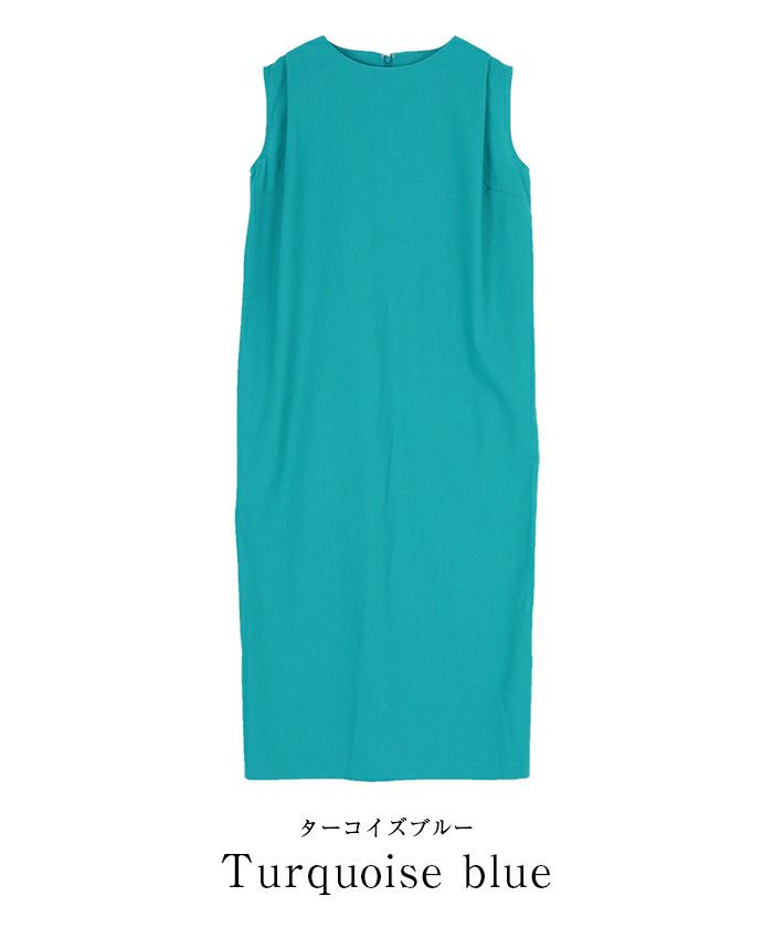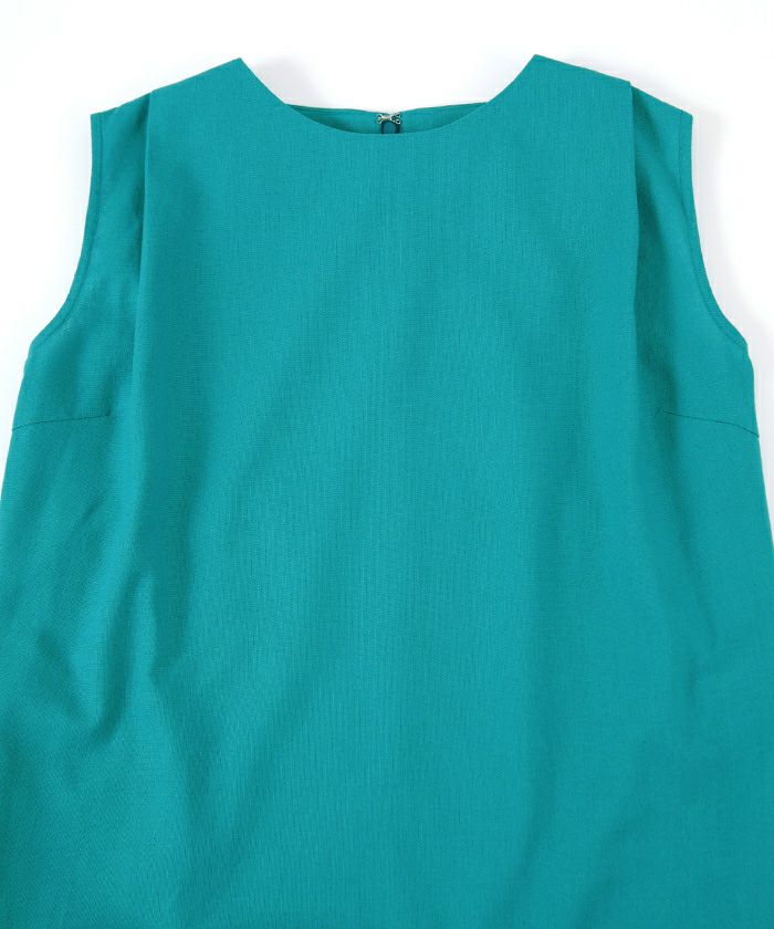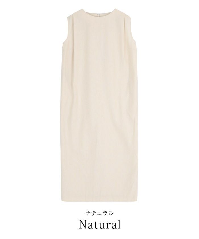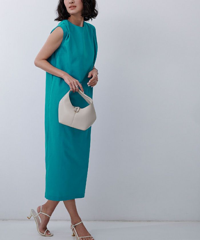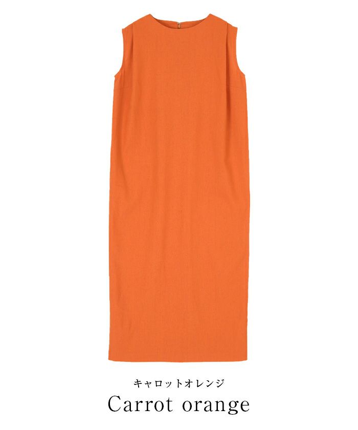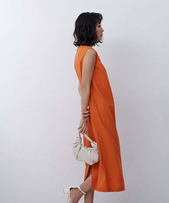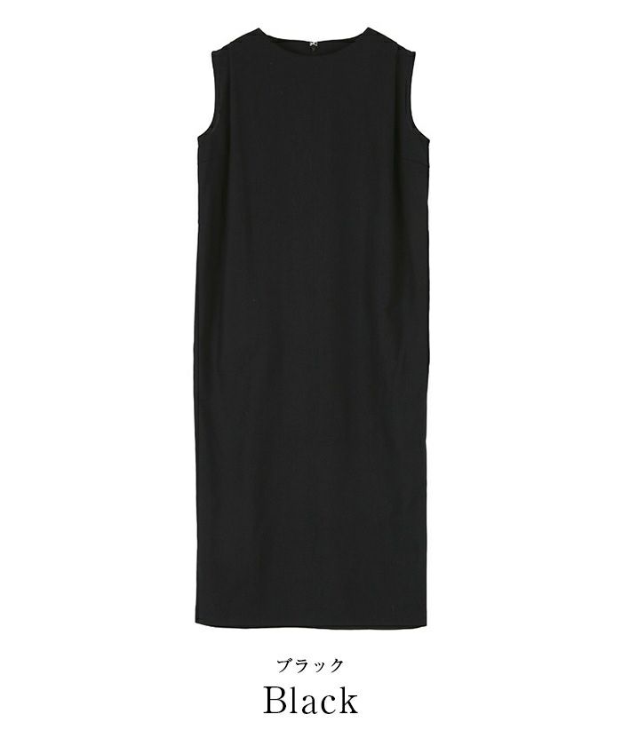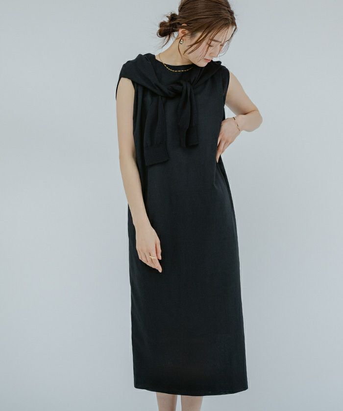 身体のラインを拾い過ぎないコクーンシルエットのノースリーブワンピース。