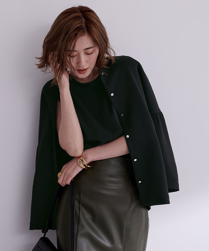 タートルネックやブラウス等、中に合わせるアイテムで着こなしに変化がつけられます。