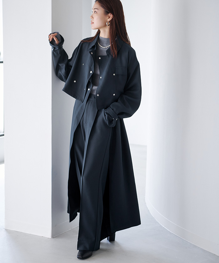 前裾、後身頃をフェイクウールを使用することにより、シルエットが大きくならないようにしました。