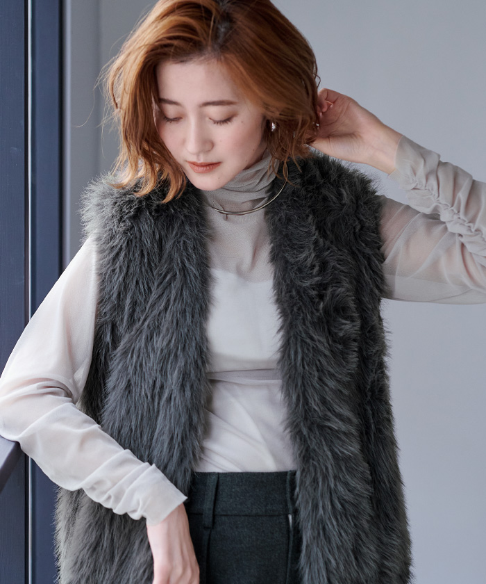 毛足の長いフェイクファーで女性らしさを演出。