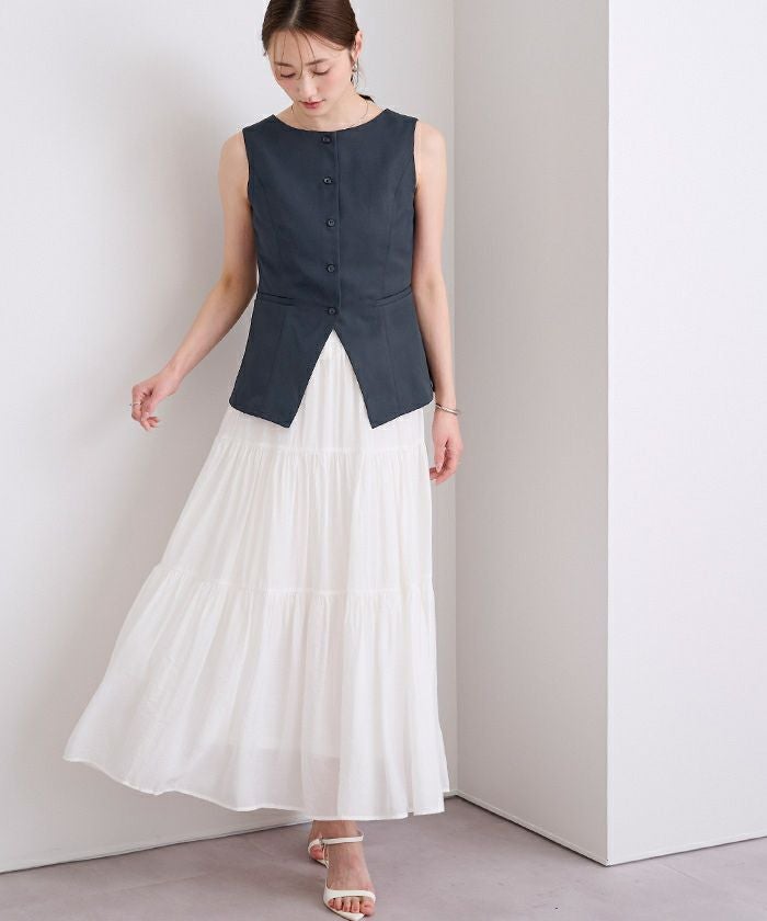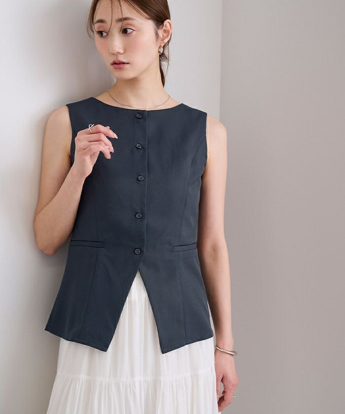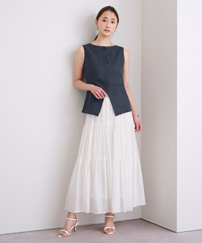 フロントボタンデザインが程よいアクセントになり、きれいめで洗練された印象に仕上がります。