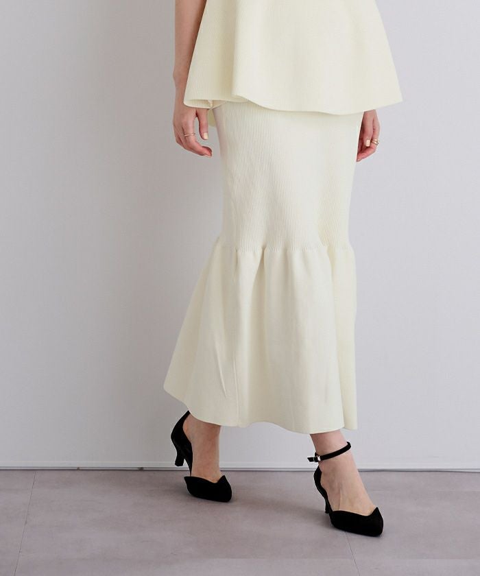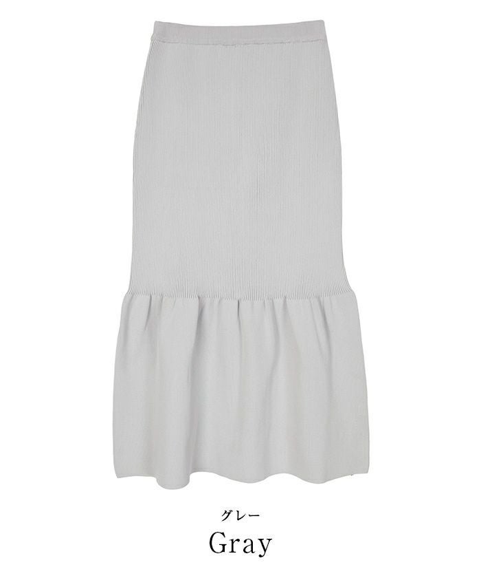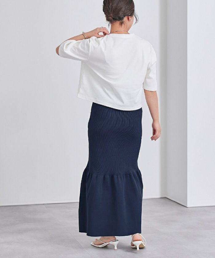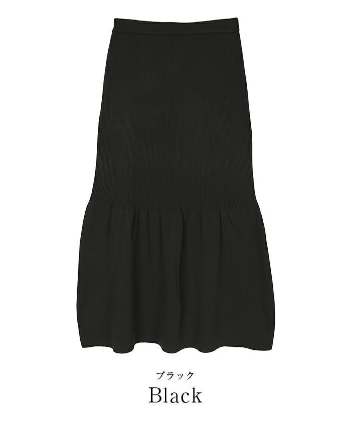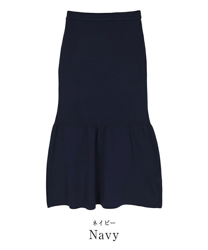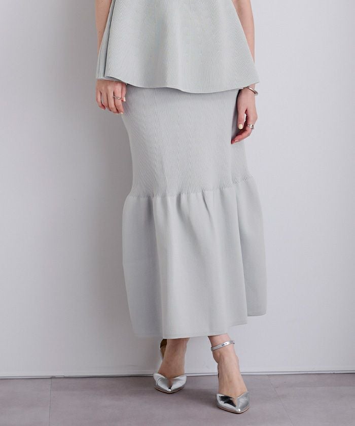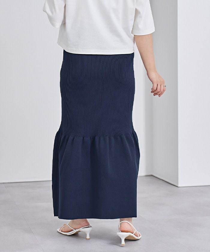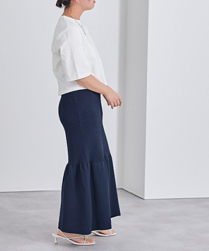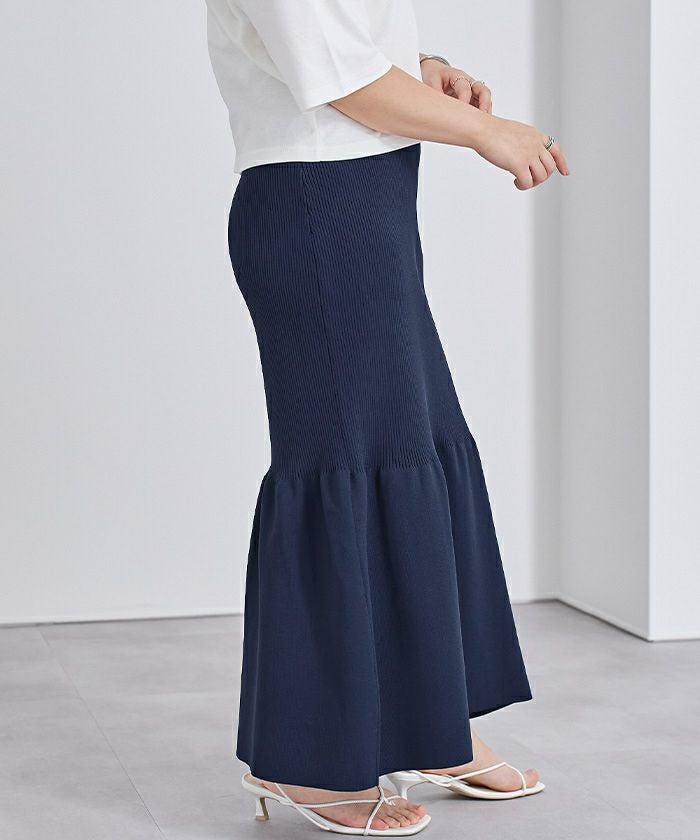 裾で切り替えたティアードデザインのニットスカート。