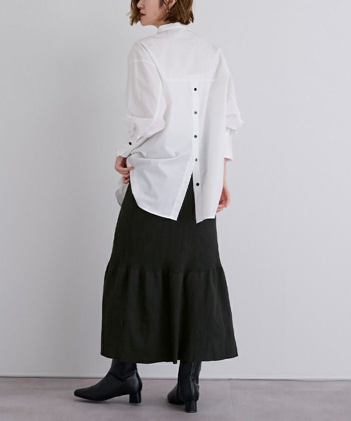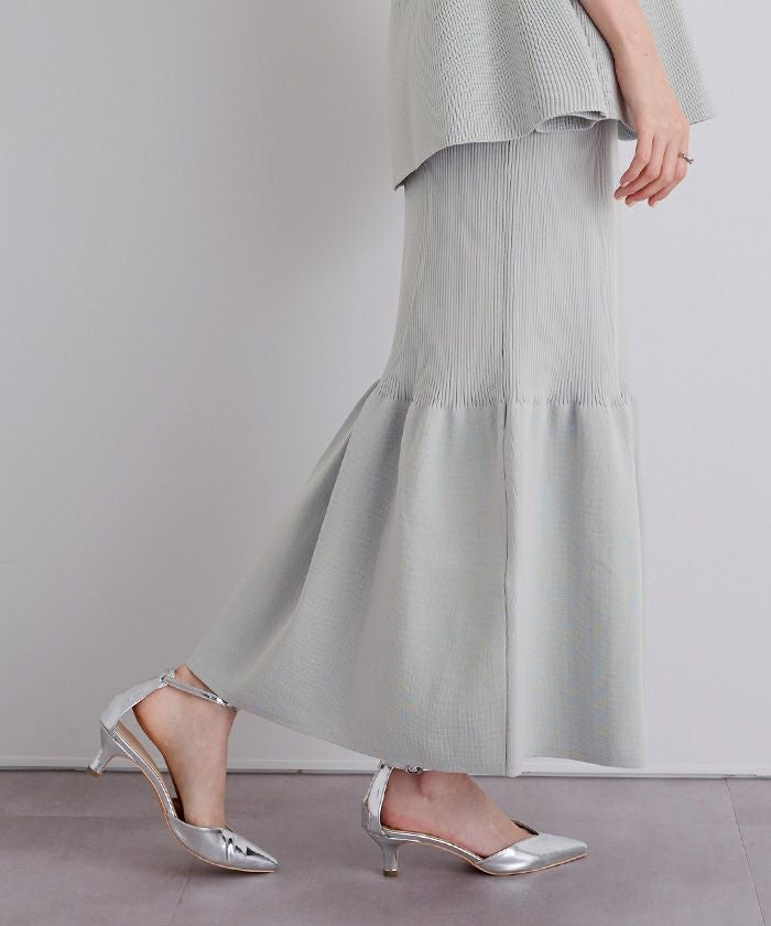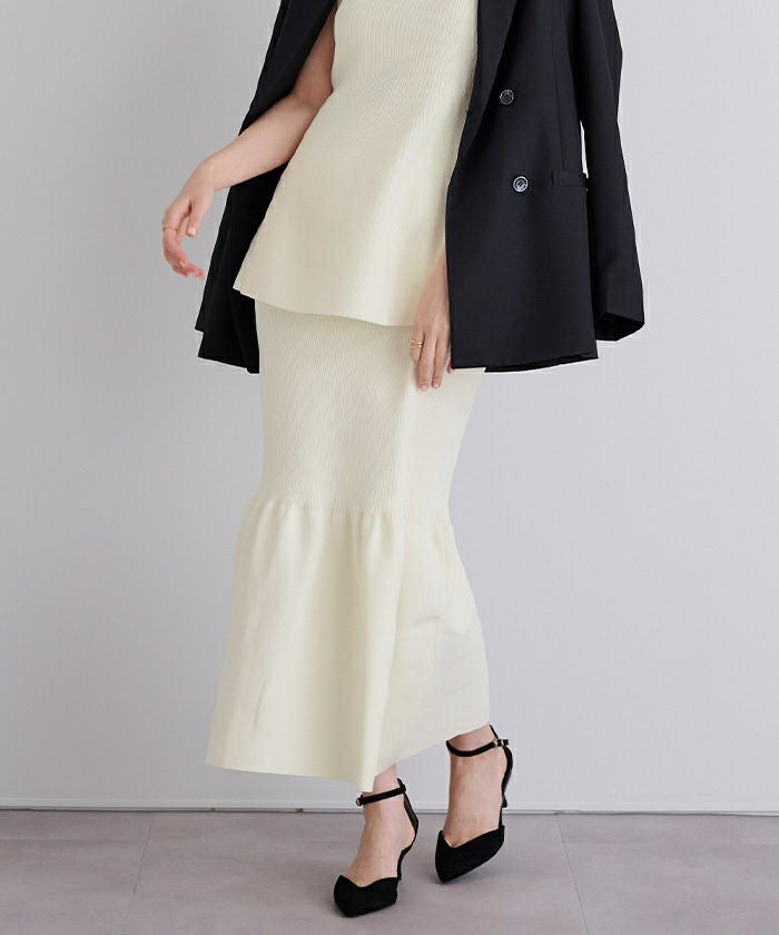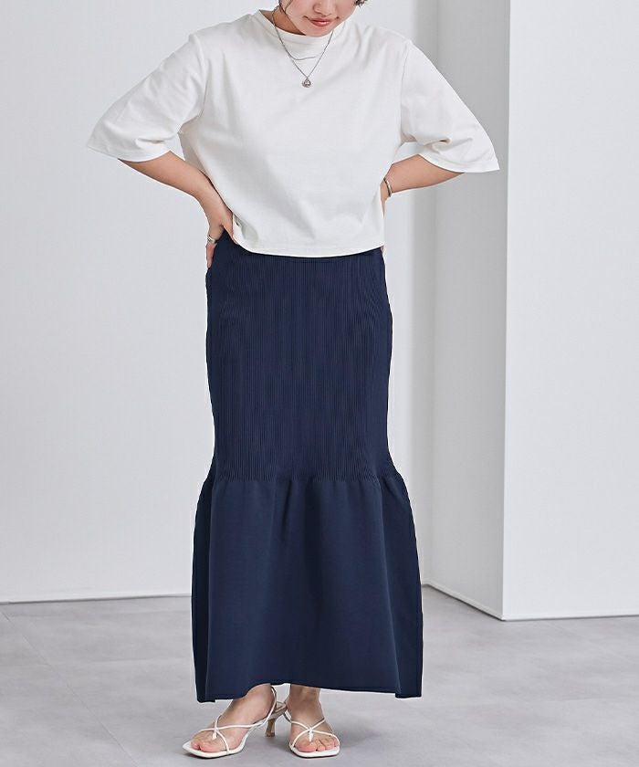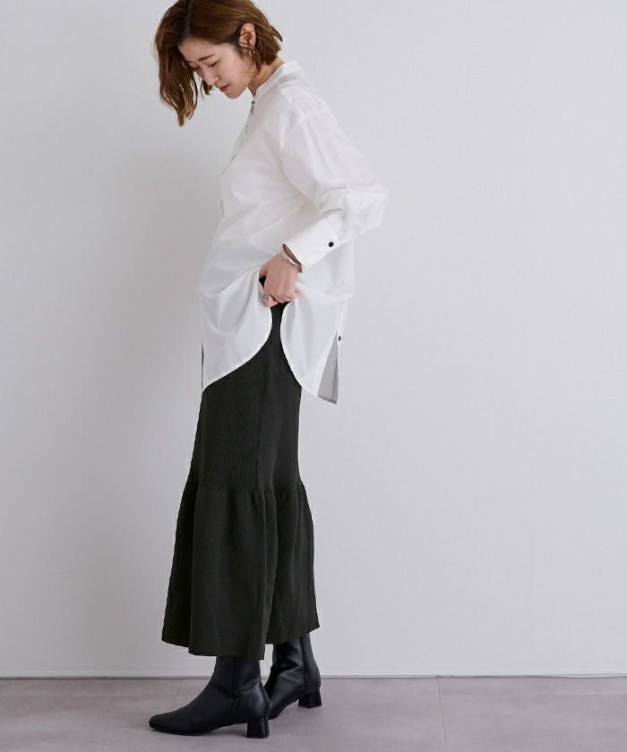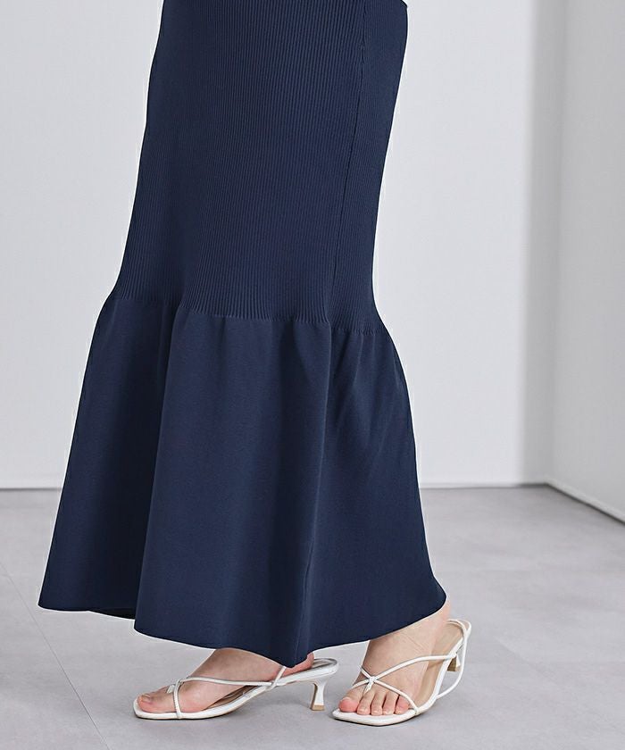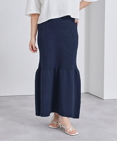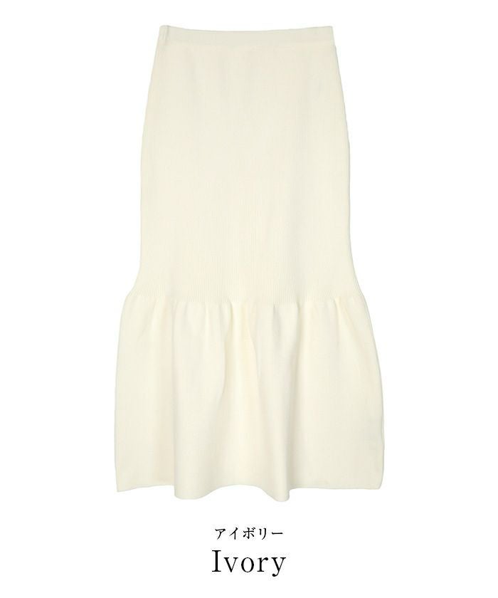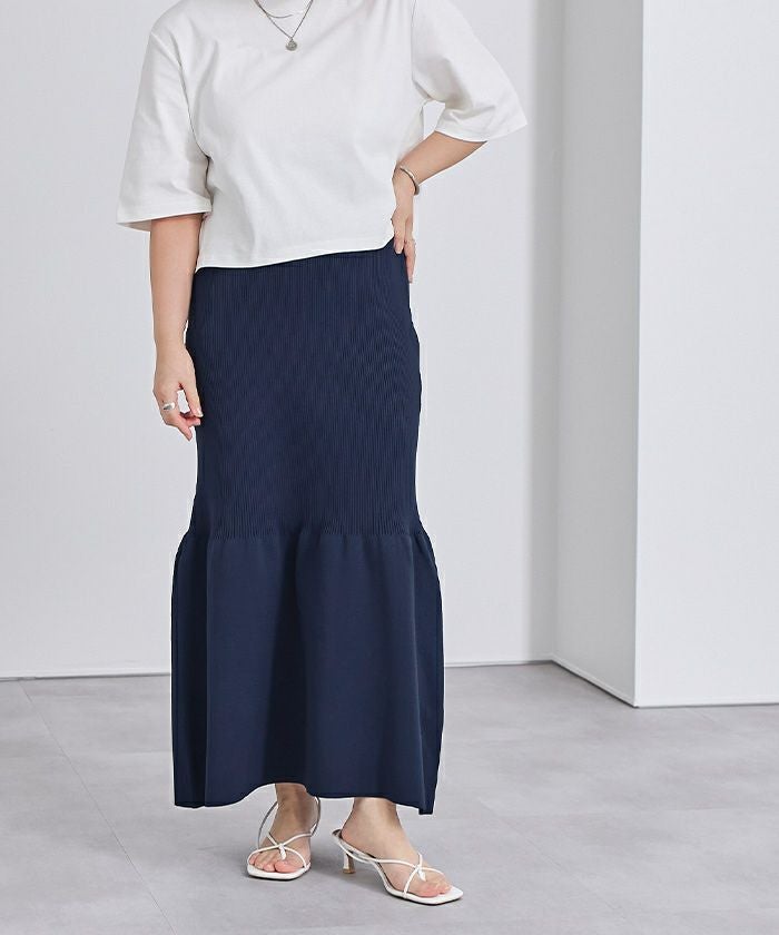 裾で切り替えたティアードデザインのニットスカート。