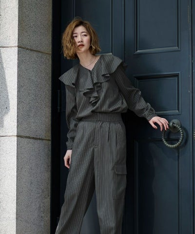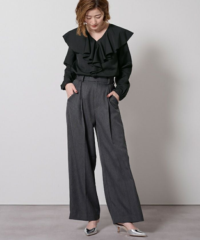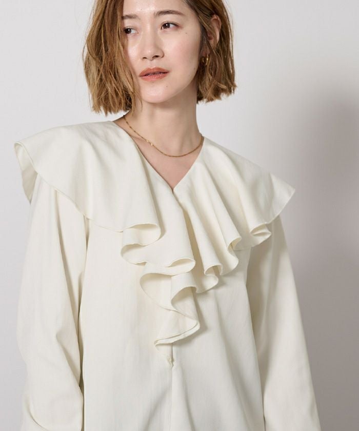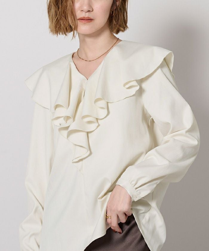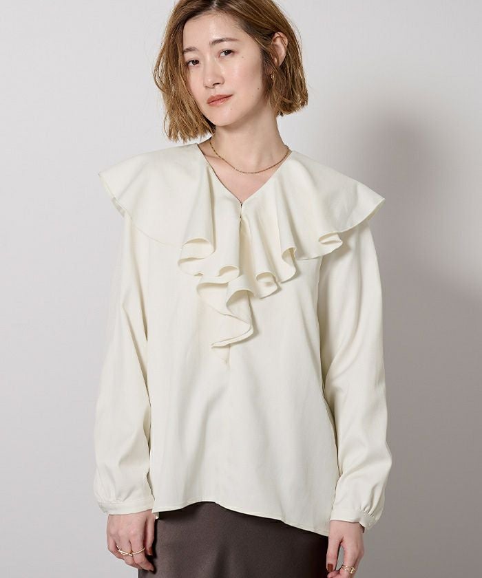 大ぶりなラッフルを大胆にあしらった華やかなブラウス。
