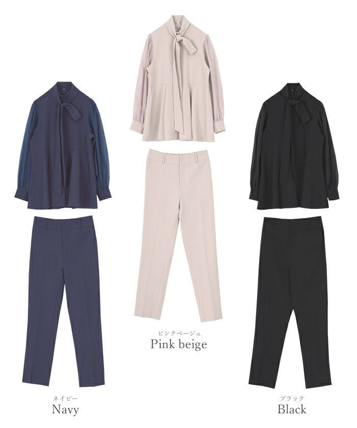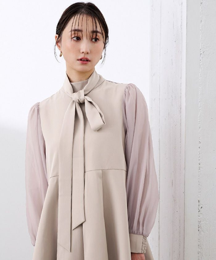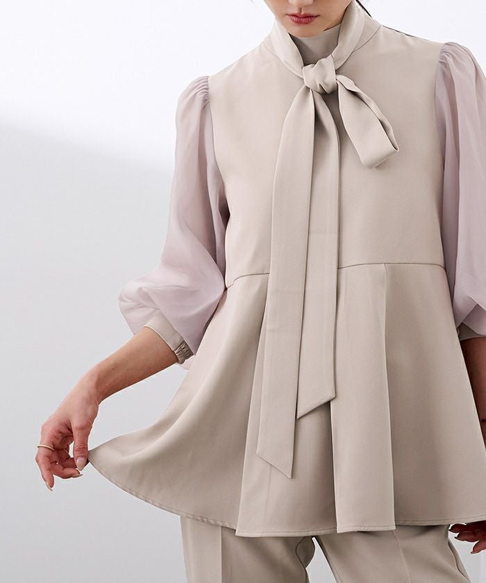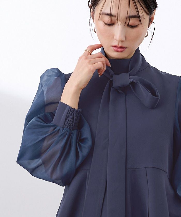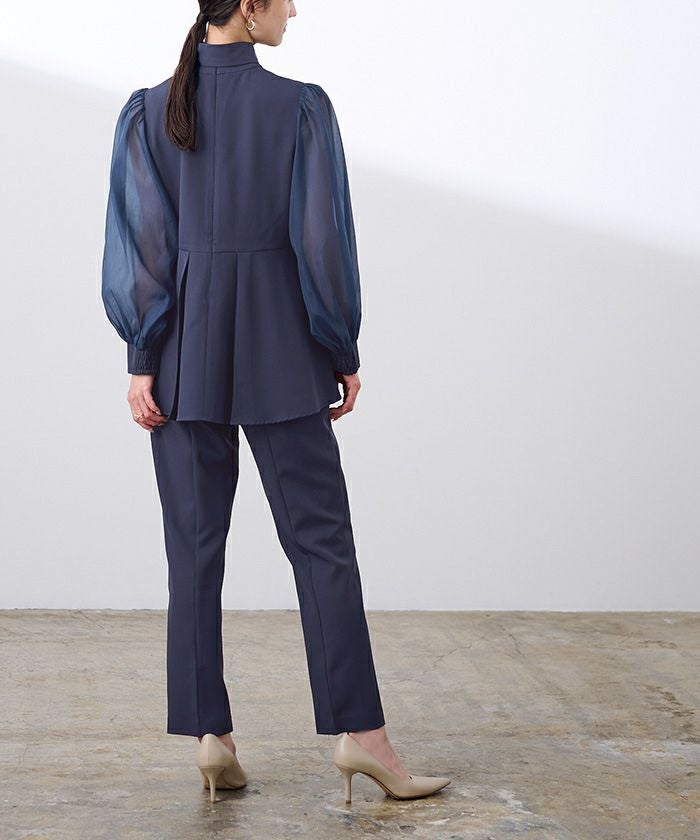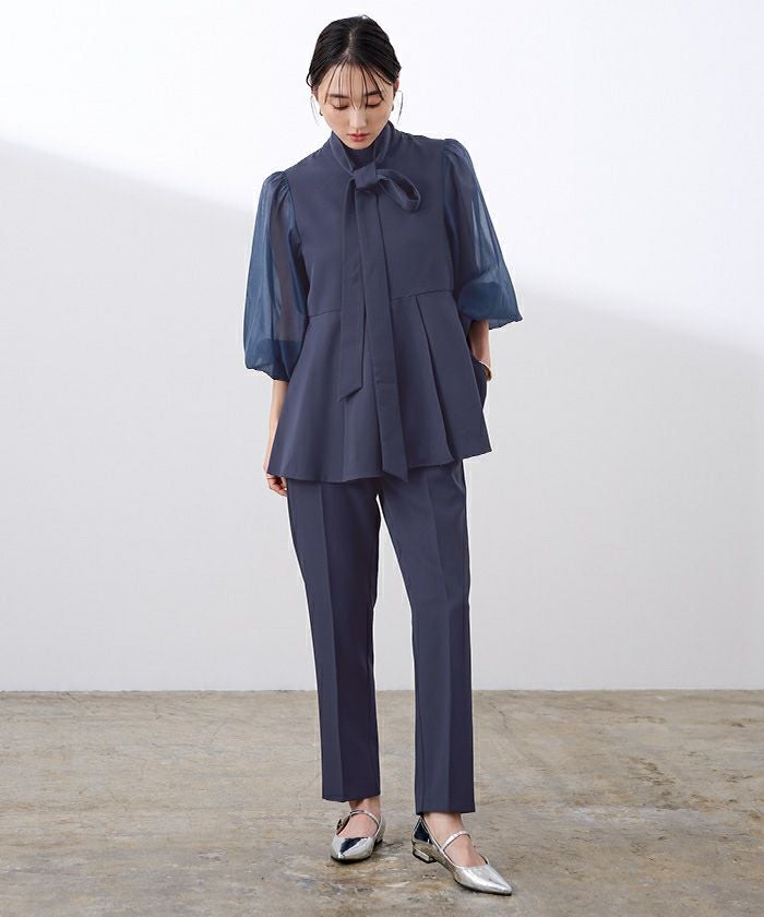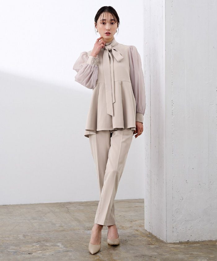 上品な華やかさを添えるボウタイデザインと、上品に透けるシアースリーブがポイントのセレモニーセットアップ。