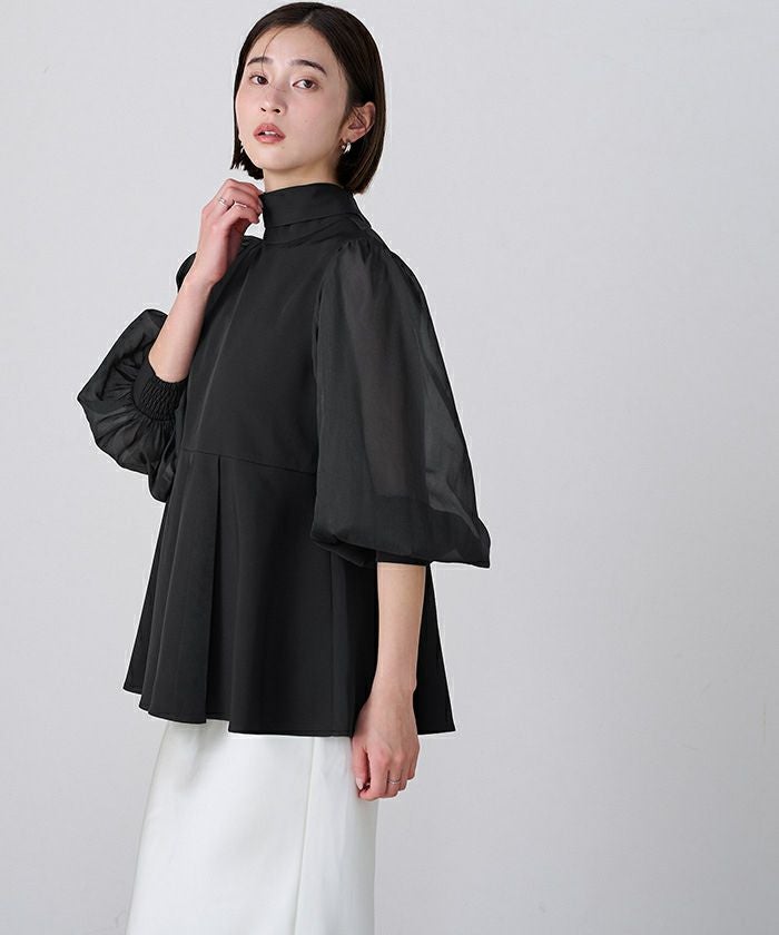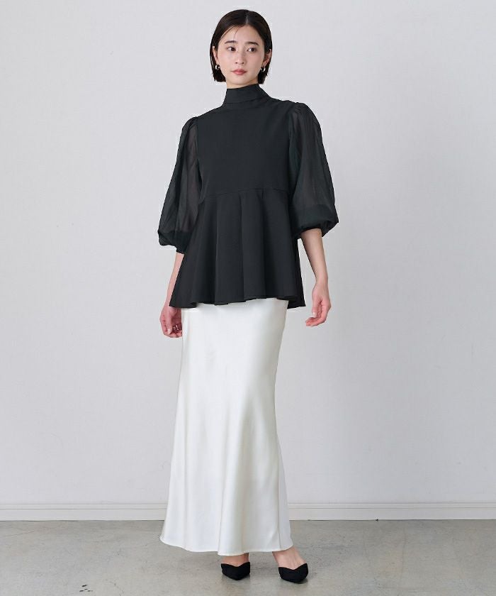 トップスは軽やかなシフォン袖が女性らしさを引き立て、肩まわりを優しく覆うため、露出を控えたい場面でも安心。