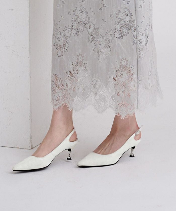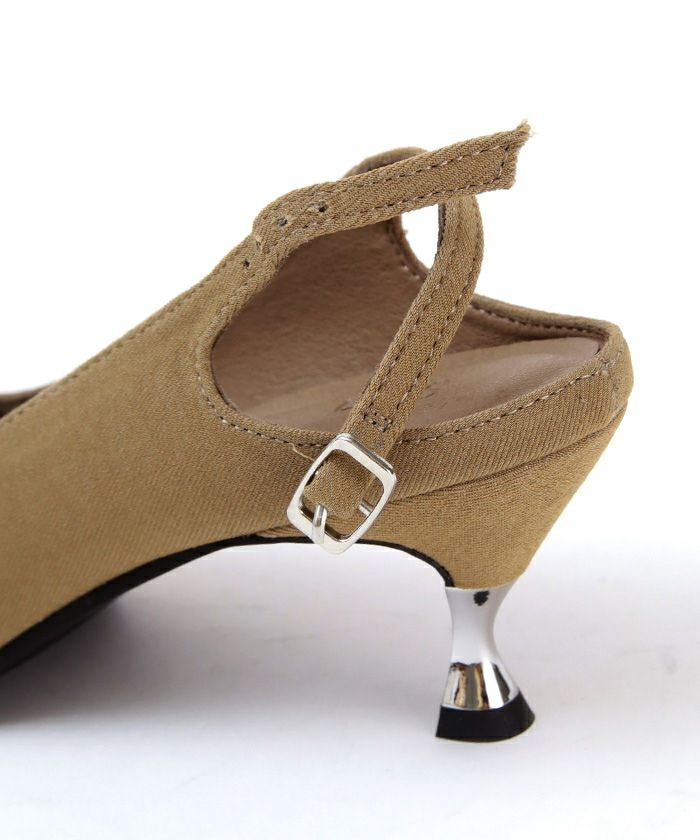 シルバーのメタルヒールがポイントのスリングバックパンプス。