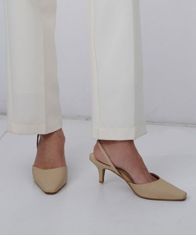 細めのヒールで女性らしい印象の足元が完成するスクエアトゥバックストラップサンダル。