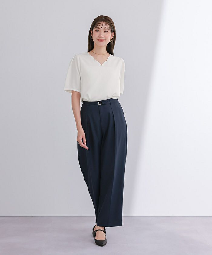 一枚で着用できるスカラップネックデザインがポイントのトップス。