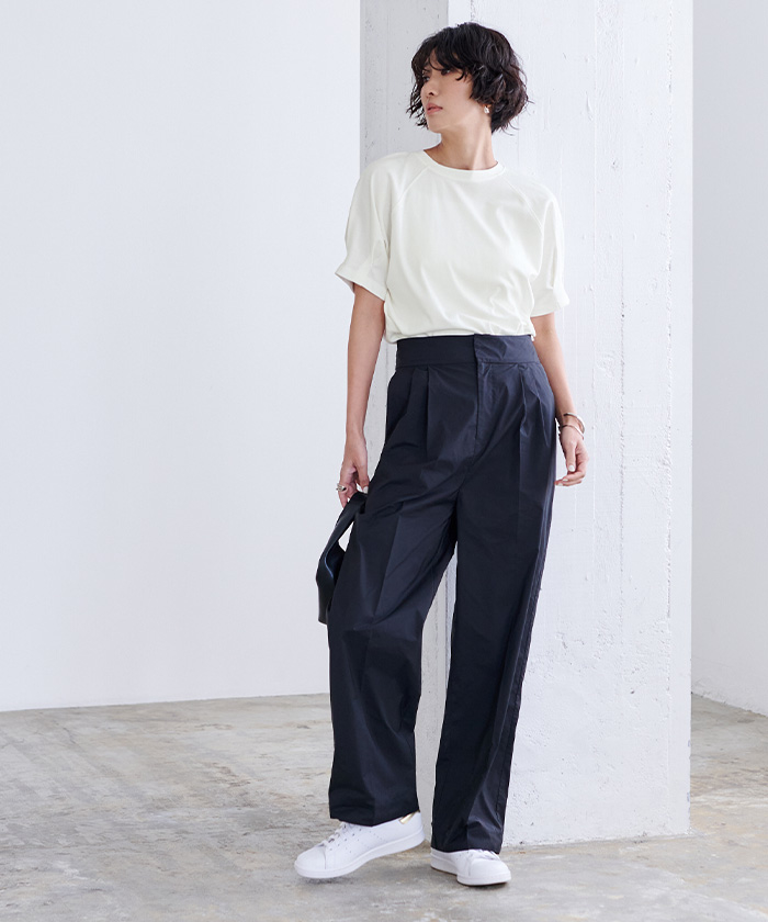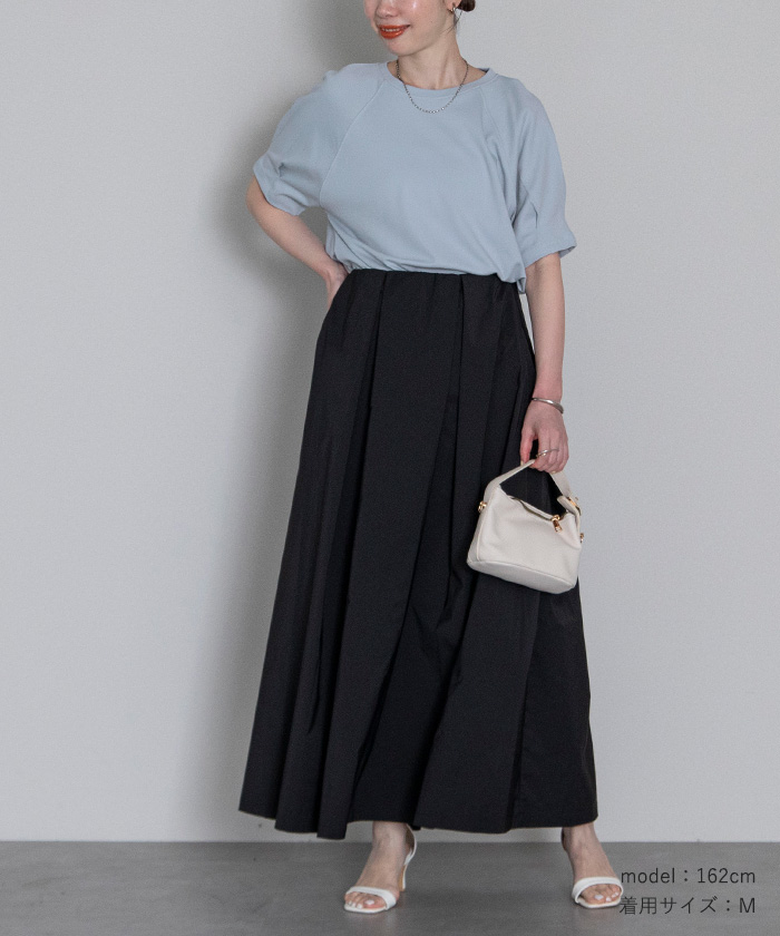 夏にぴったりな汗染みが軽減できる素材のボリュームスリーブTシャツ。