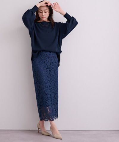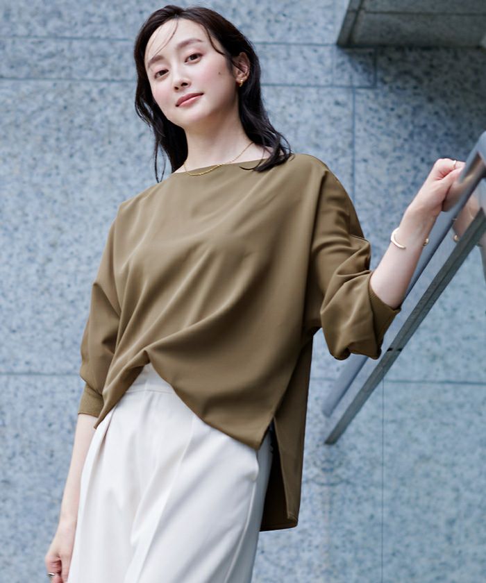 ボートネックが顔周りをすっきり見せてくれるプルオーバー。