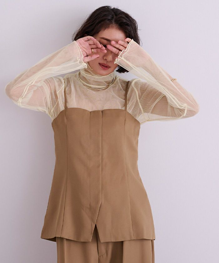 チュールが2重に重なったレイヤードトップスで1枚でもオシャレに決まるトップスです。