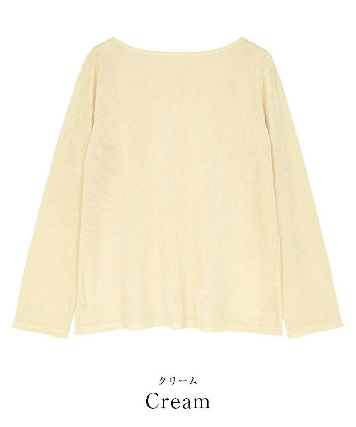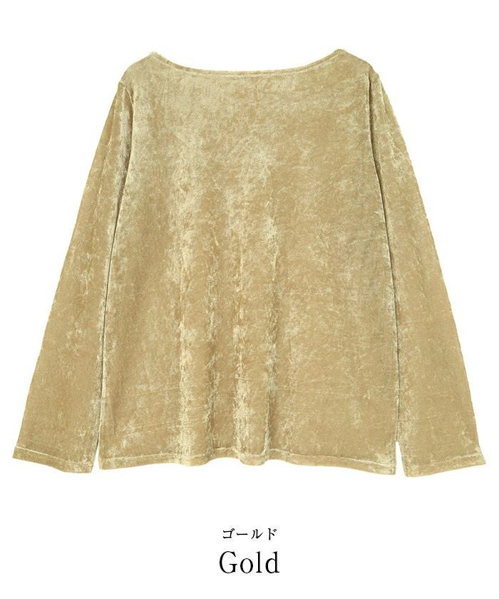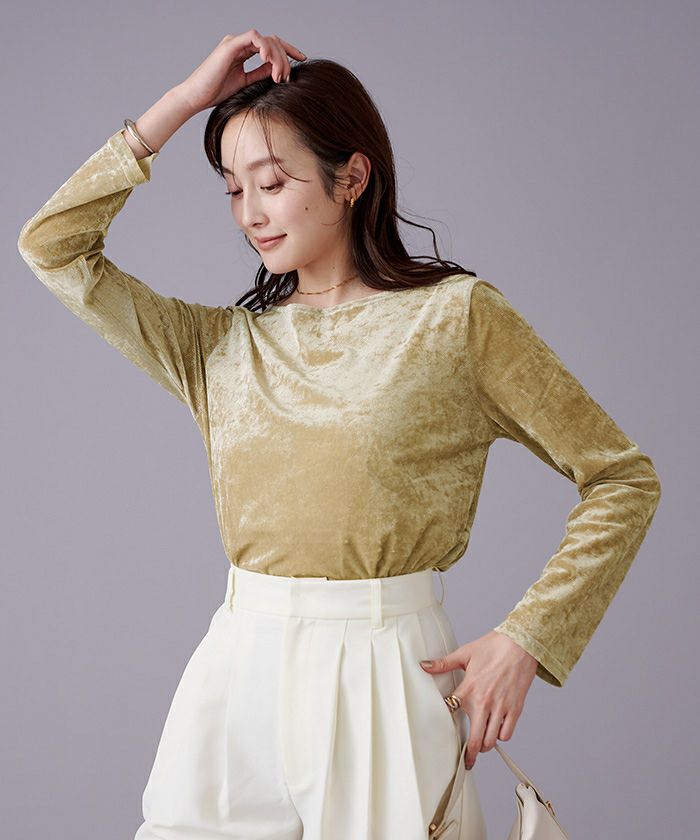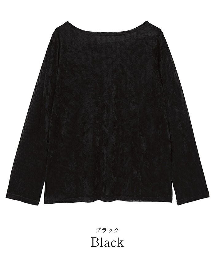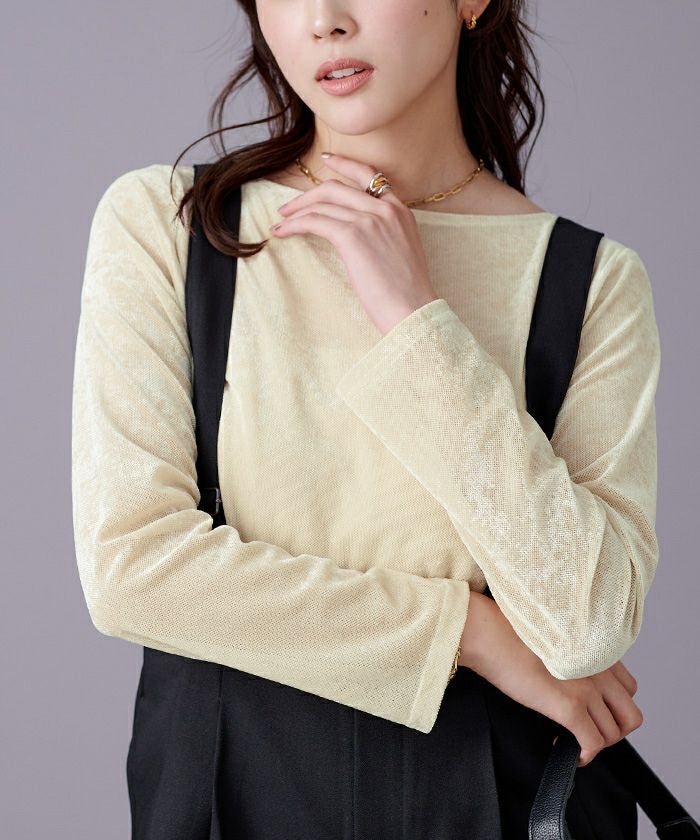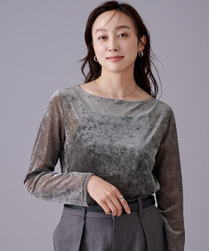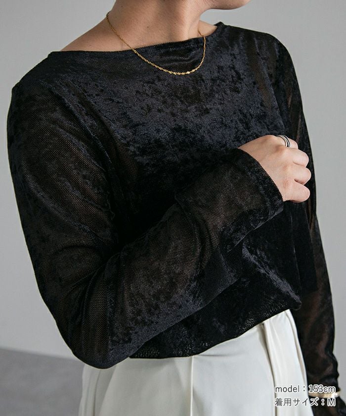 メッシュベロア素材のボートネックトップス。