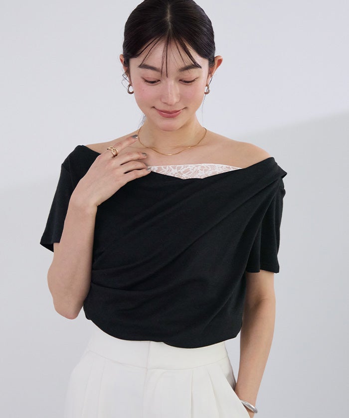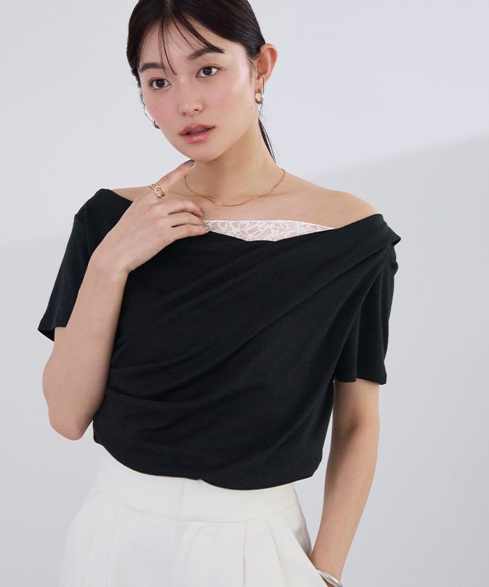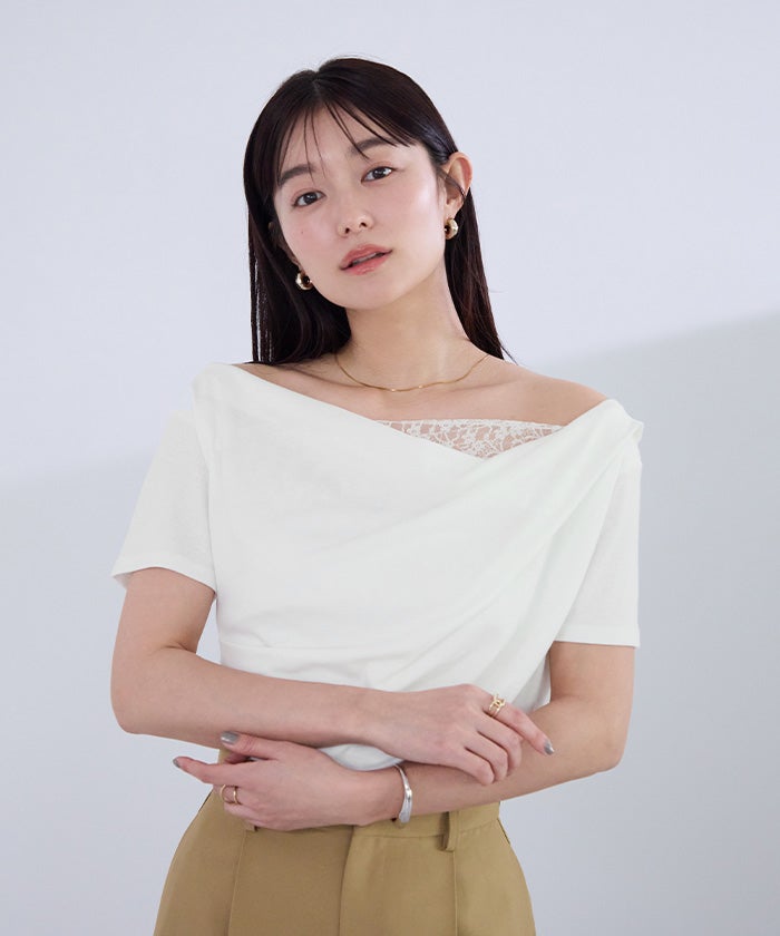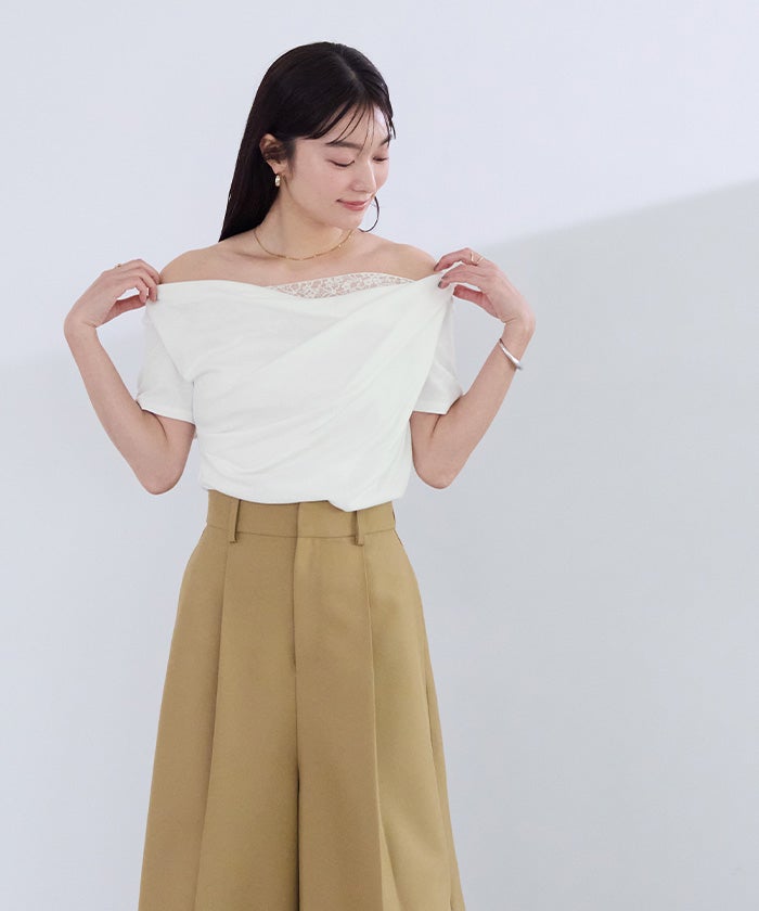 オフショルダーハーフスリーブレースドッキングTシャツ【メール便可/100】