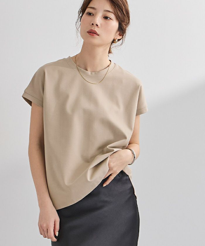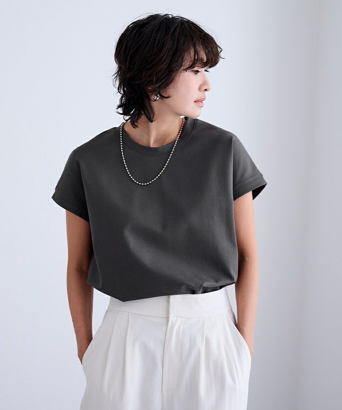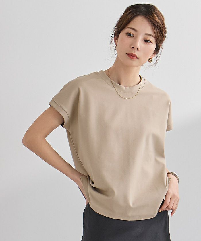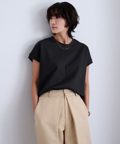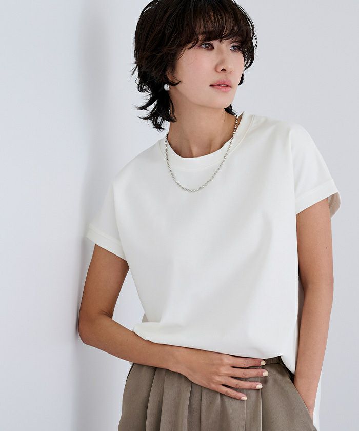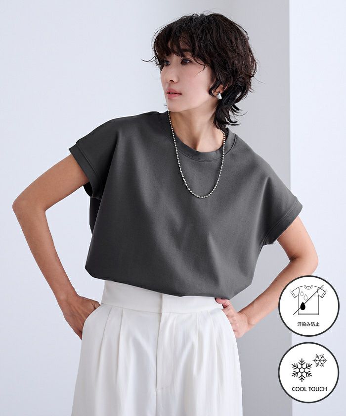 接触冷感機能を備えた、ひんやりとした肌触りのカットソー素材を使用。