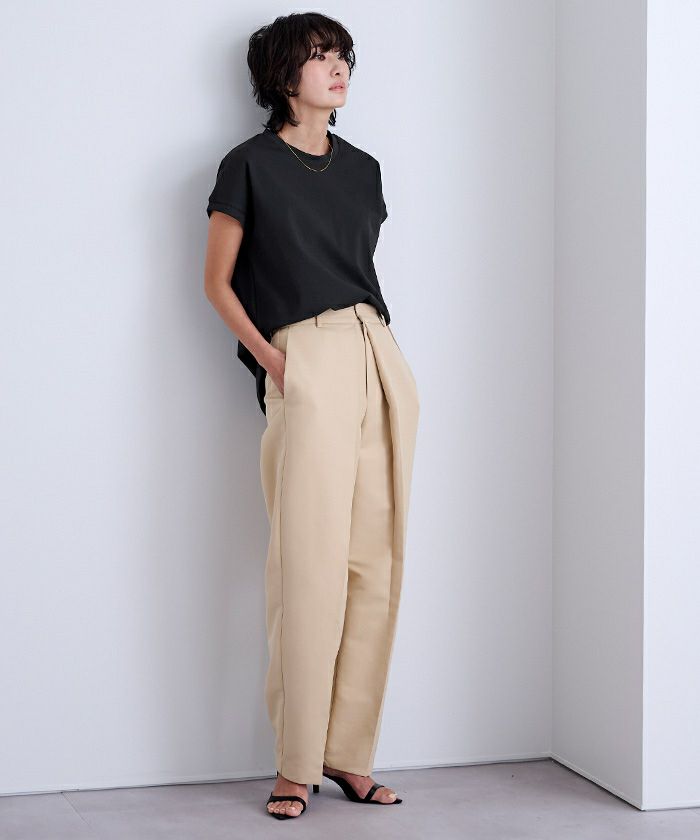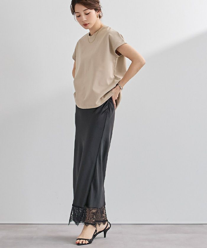 程よくゆとりのあるシルエットで、身体のラインを拾いにくく、1枚でも安心感のある着心地です。