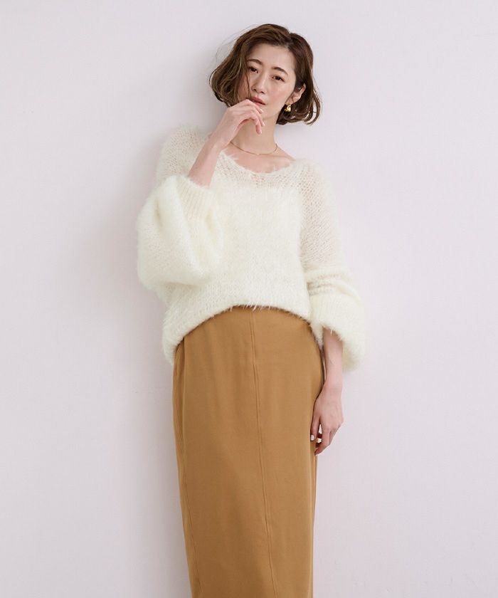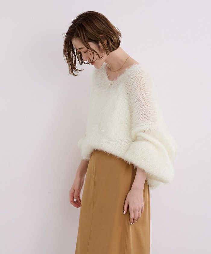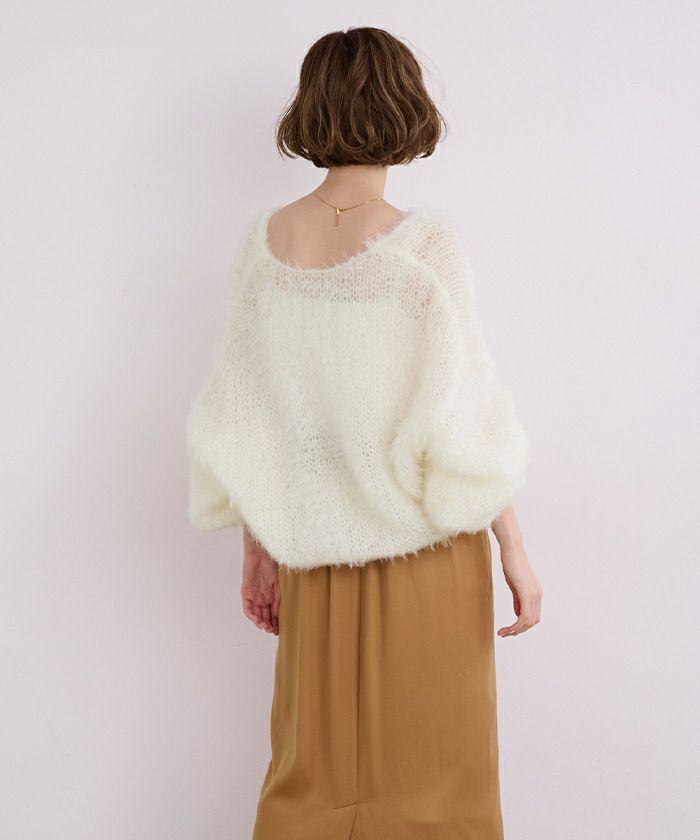 ローゲージでしっかりとした厚みですが、透け感のある編地にして抜け感を出しました。