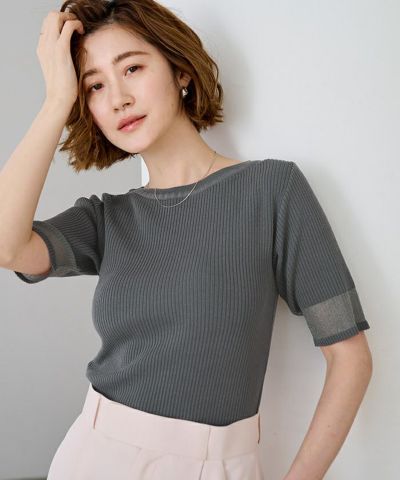 袖口のシアー部分がさりげなく抜け感をプラスしてくれる5分袖ニット。