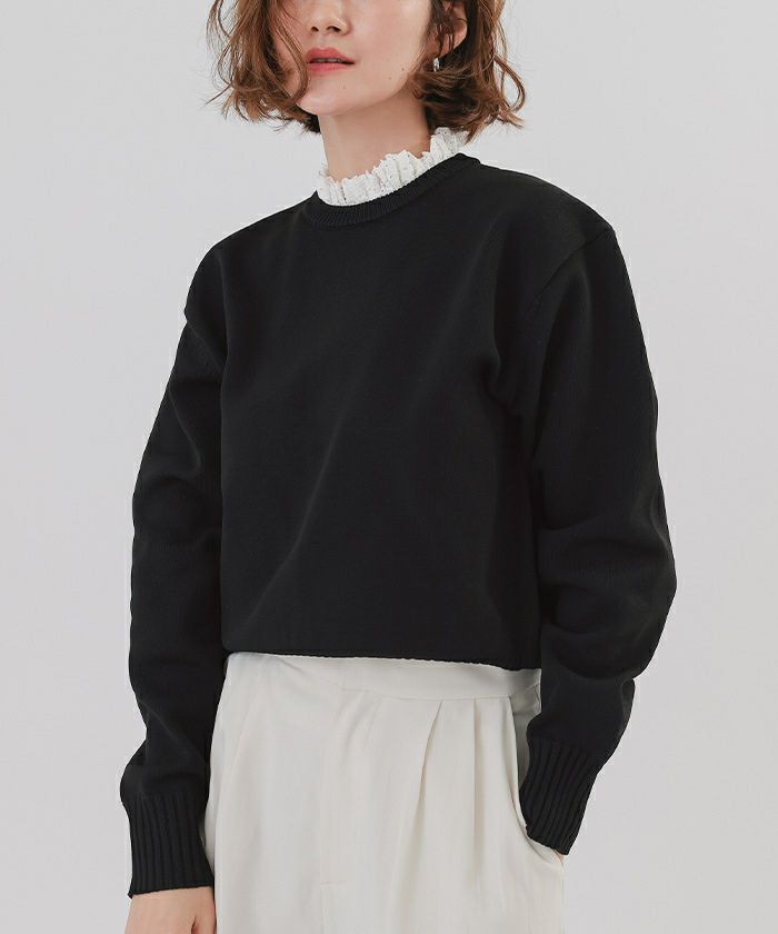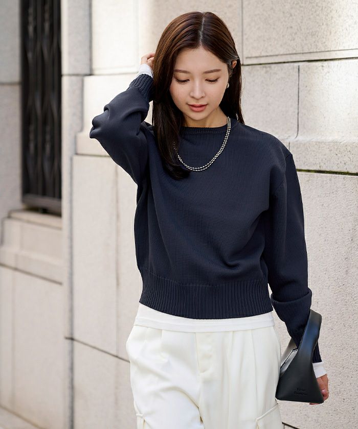 ニット素材ながらも形をきれいに保つため、スウェット感覚で着られつつも上品な印象をキープ。