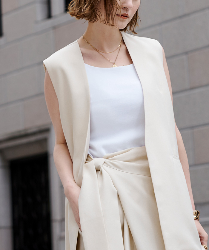 バンドカラーと比翼仕立てで襟元にきちんと感を演出。