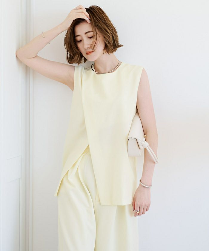 フロントのレイヤードがポイントのノースリーブブラウス。