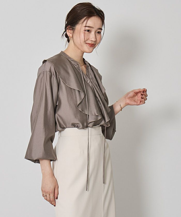 今年のドレッシーなムードに合うラッフルカラーデザインのブラウス。