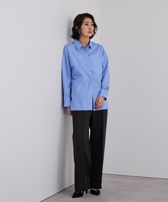 ・バストや袖周りはゆとりありつつ、裾と袖口にかけて細いすっきり見えるシルエットになってます。