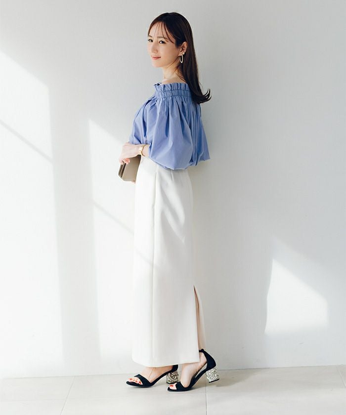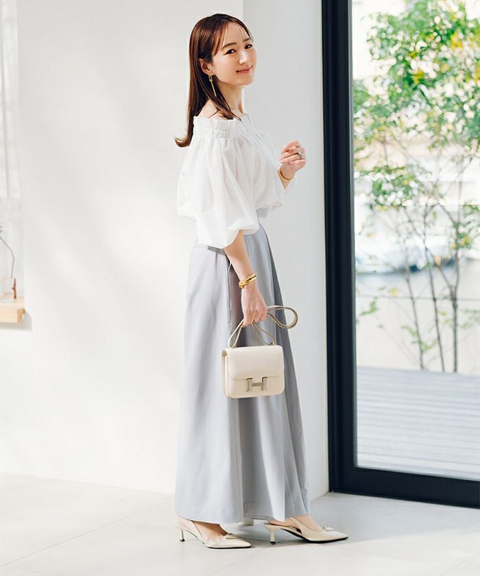 オフショルダーのトップスは、肩にしっかりと留まるように程よくフィットするサイズ感で仕立てられています。予めご了承ください。