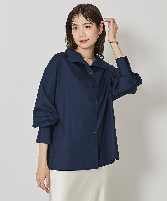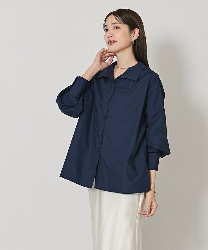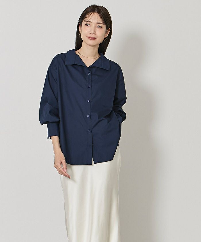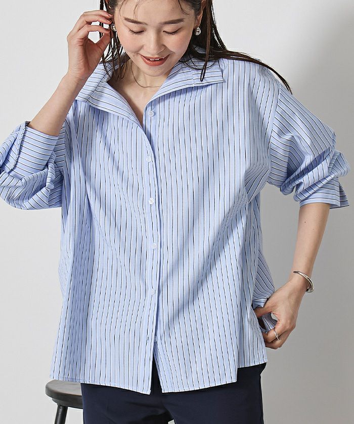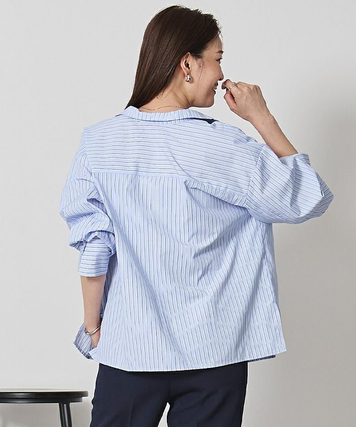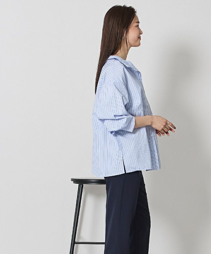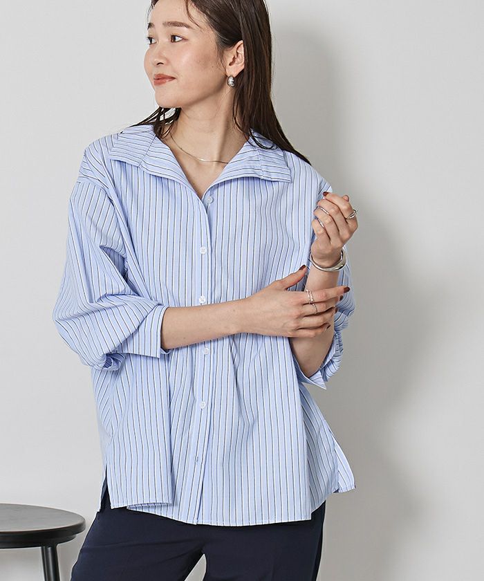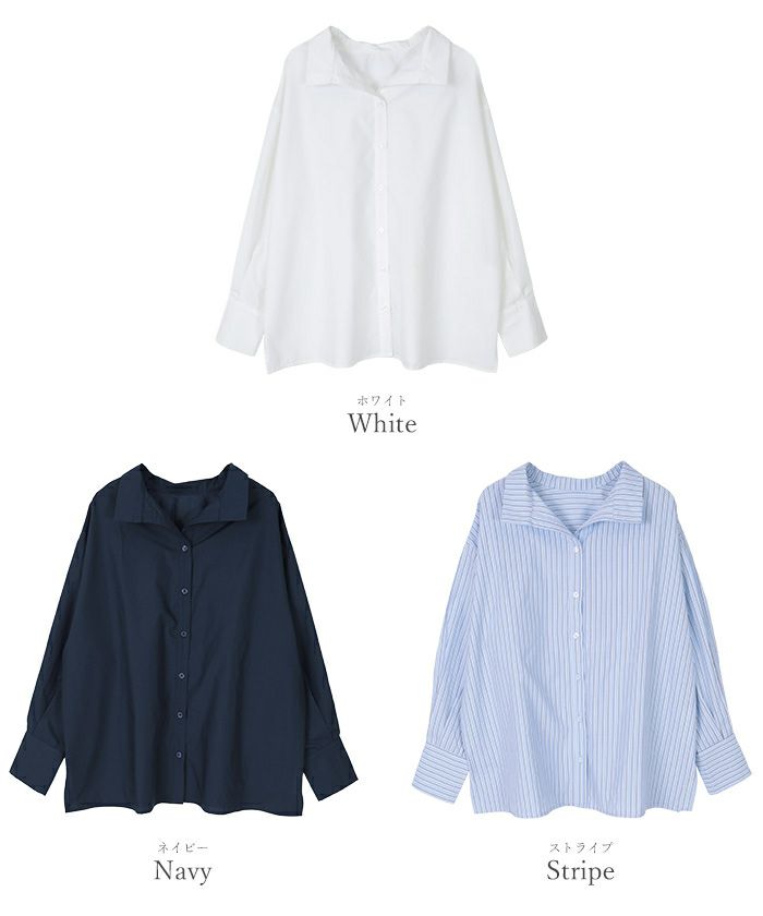 少しオーバーサイズなシルエットで、こなれた印象に仕上げました。抜け感のあるオープンネックが女性らしさを引き立てます。カラーはホワイト、ネイビー、ストライプの3色展開。シンプルなパンツと合わせれば、オフィスコーデにもぴったりです。
