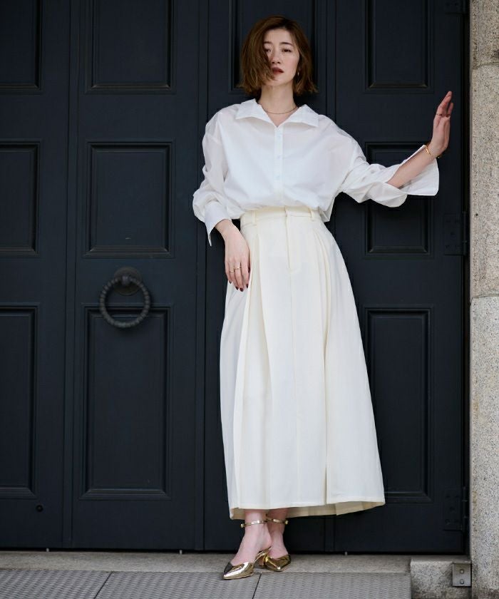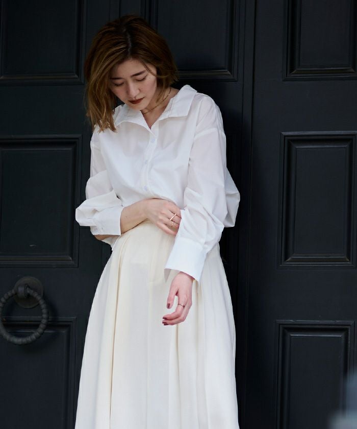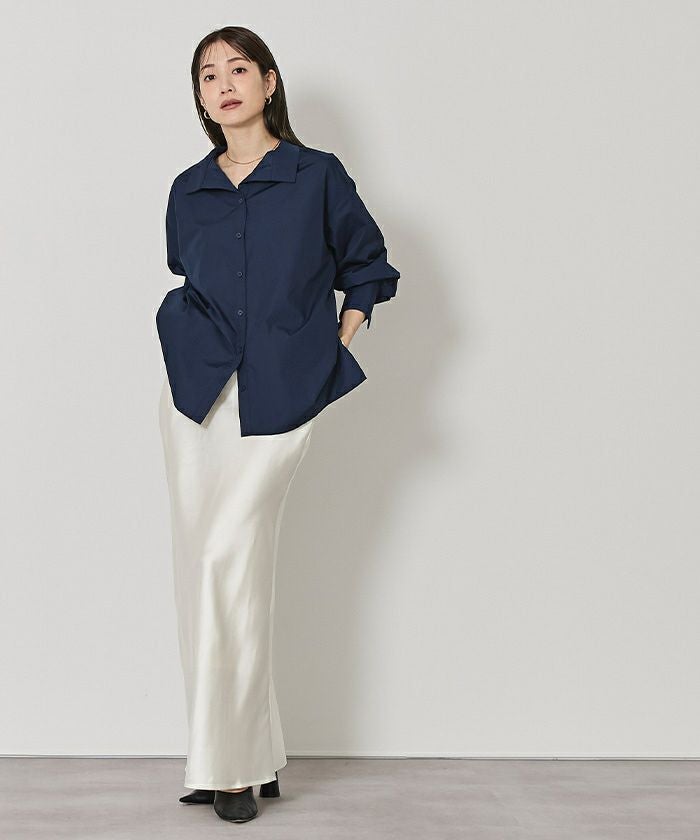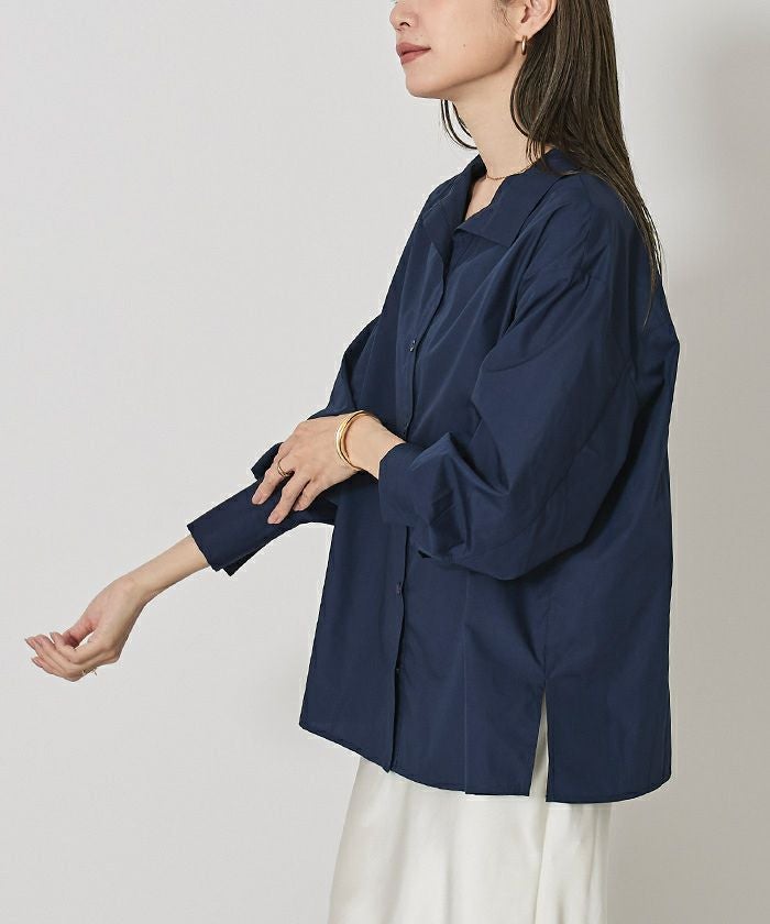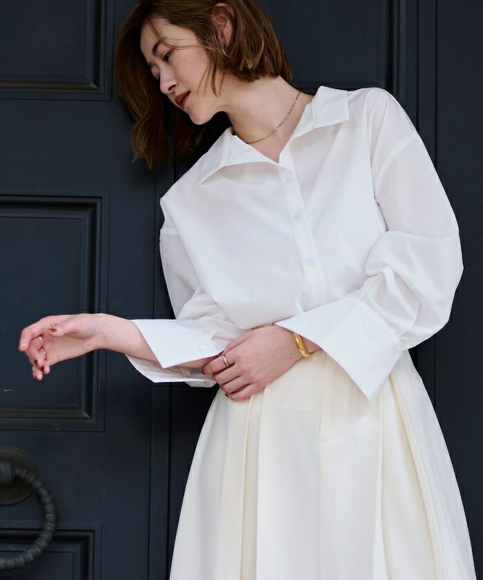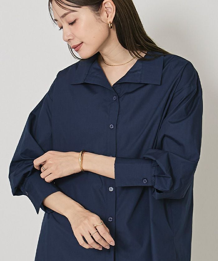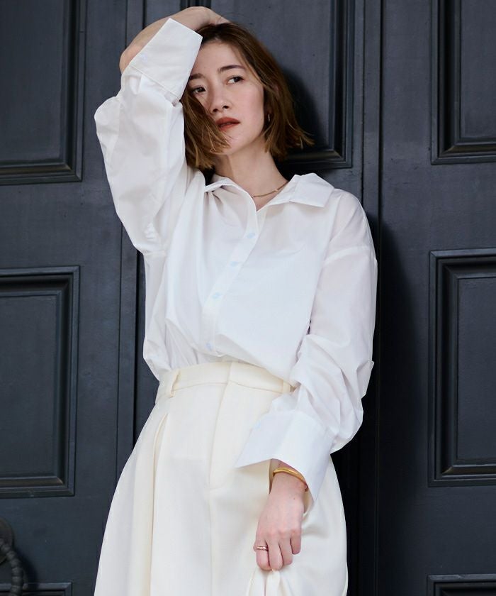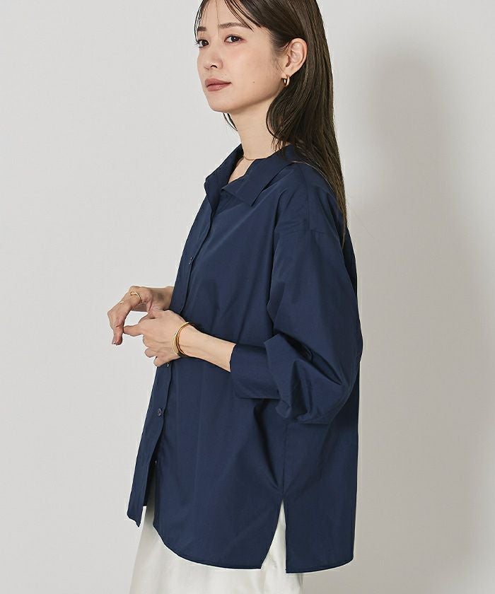 少しオーバーサイズなシルエットで、こなれた印象に仕上げました。抜け感のあるオープンネックが女性らしさを引き立てます。カラーはホワイト、ネイビー、ストライプの3色展開。シンプルなパンツと合わせれば、オフィスコーデにもぴったりです。