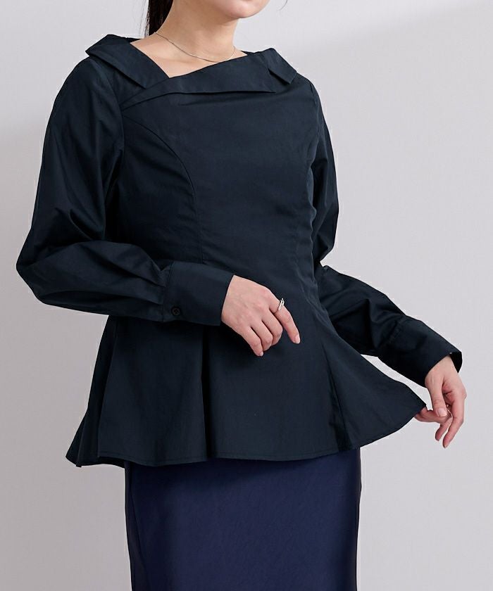アシンメトリーに仕立てた衿元がデコルテを美しく見せて、女性らしい抜け感をプラス。