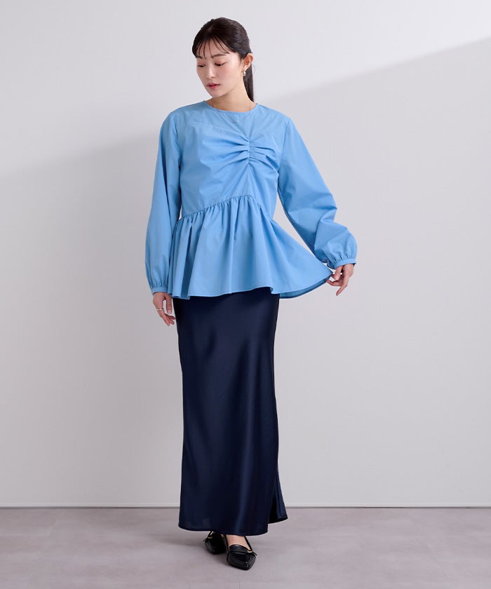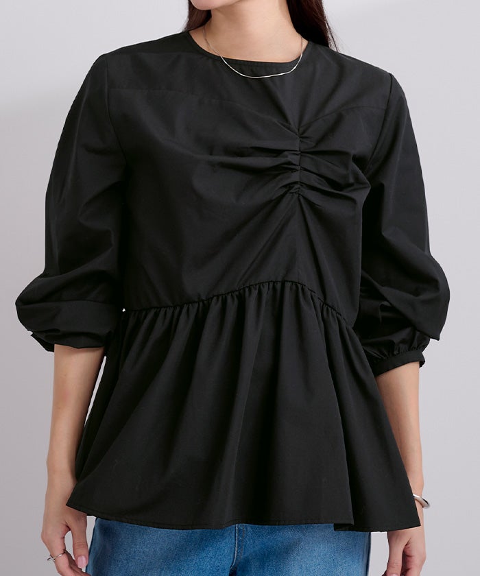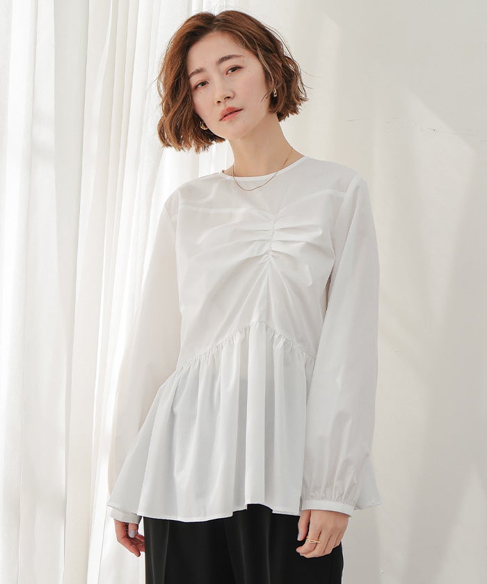 フロントの立体的なデザインが目を惹くペプラムブラウス。