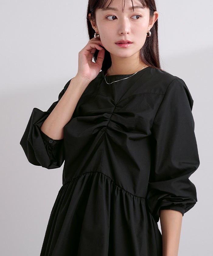 ウエストから裾にかけてふんわりと広がるシルエットで、ヒップまわりを自然にカバーしてくれます。