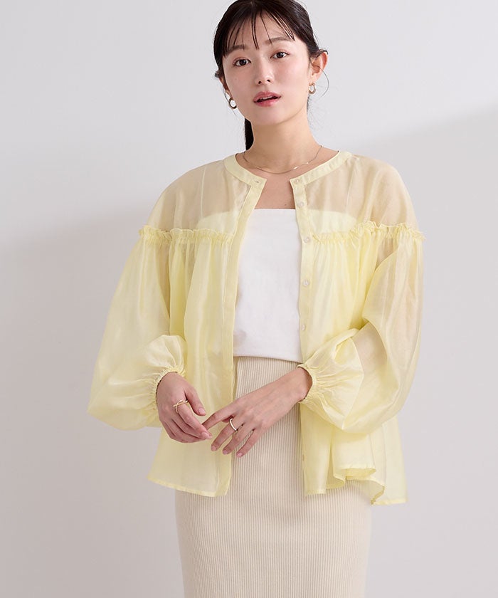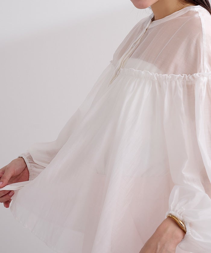 ヨーク切り替え部分にたっぷりとギャザーを寄せることで、ふんわりとしたシルエットを生み出し、女性らしさを演出します。ゆったりとしたサイズ感で羽織りとしても着用でき、幅広いスタイリングに活躍する一枚です。