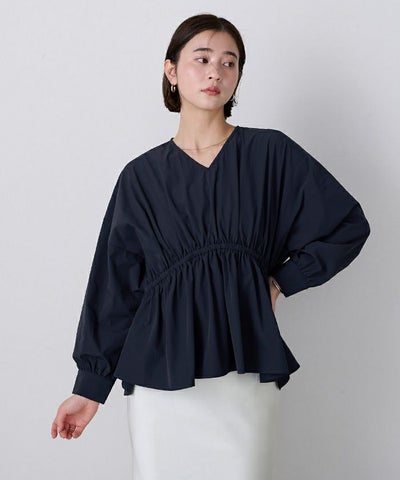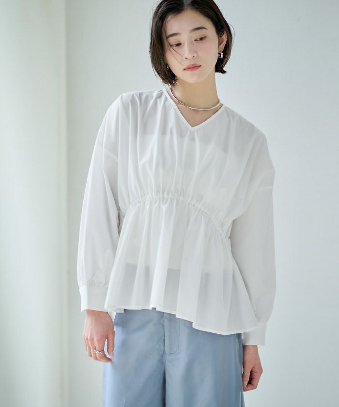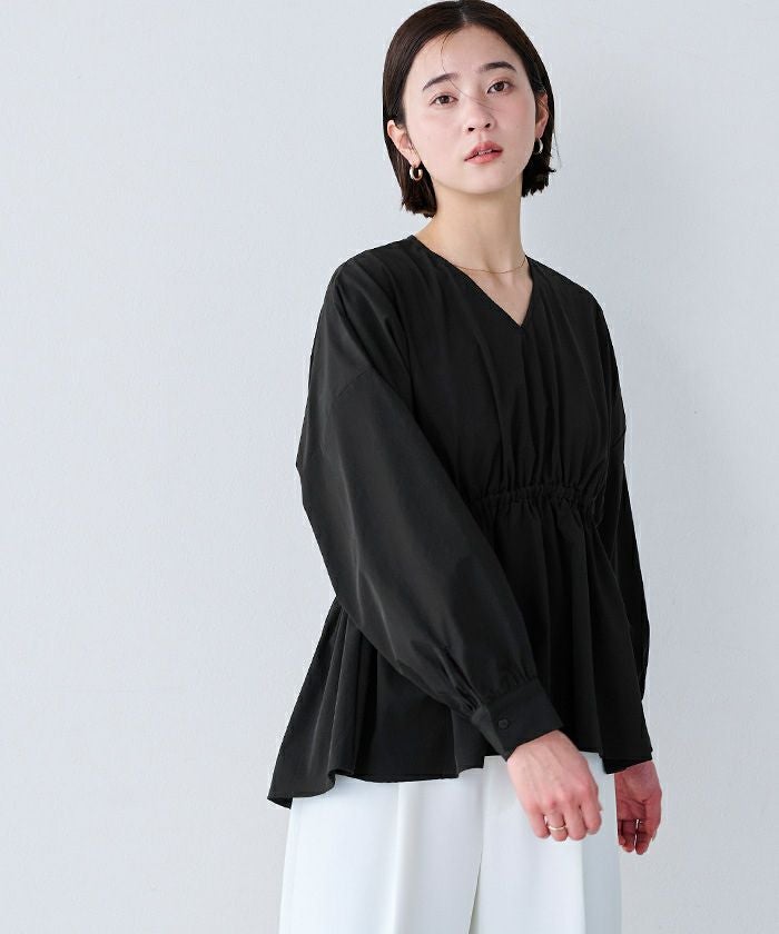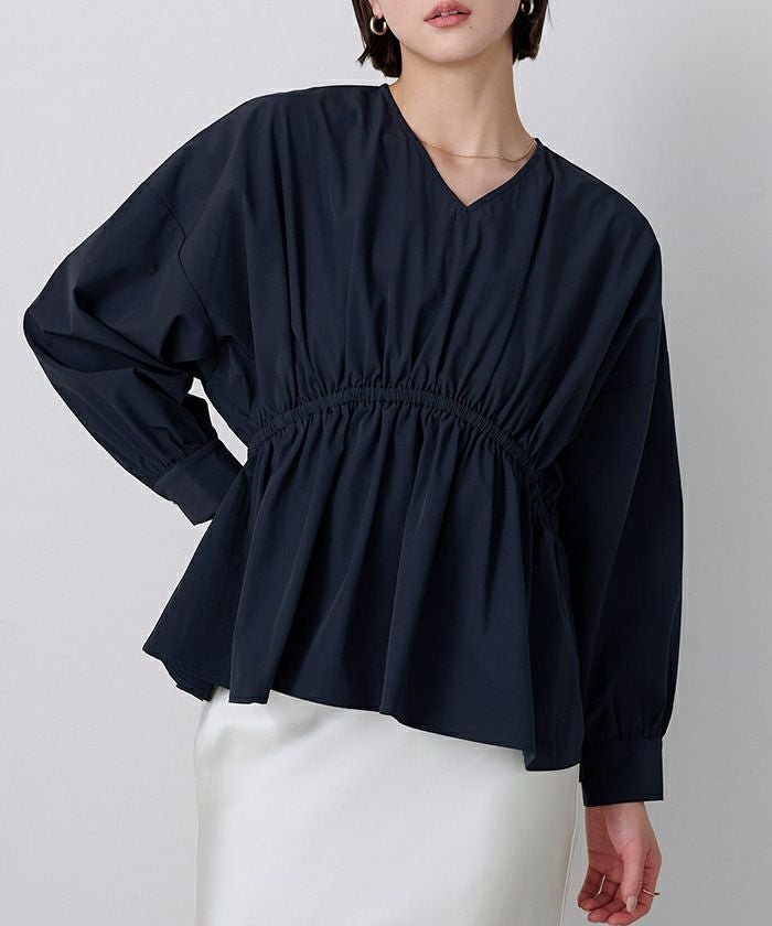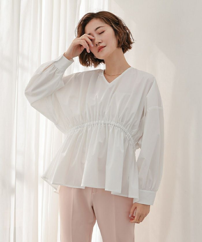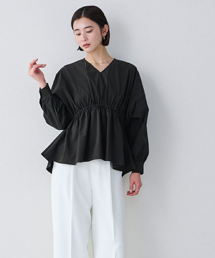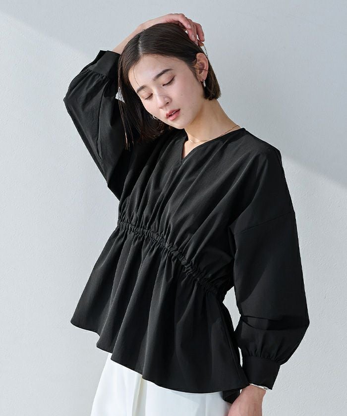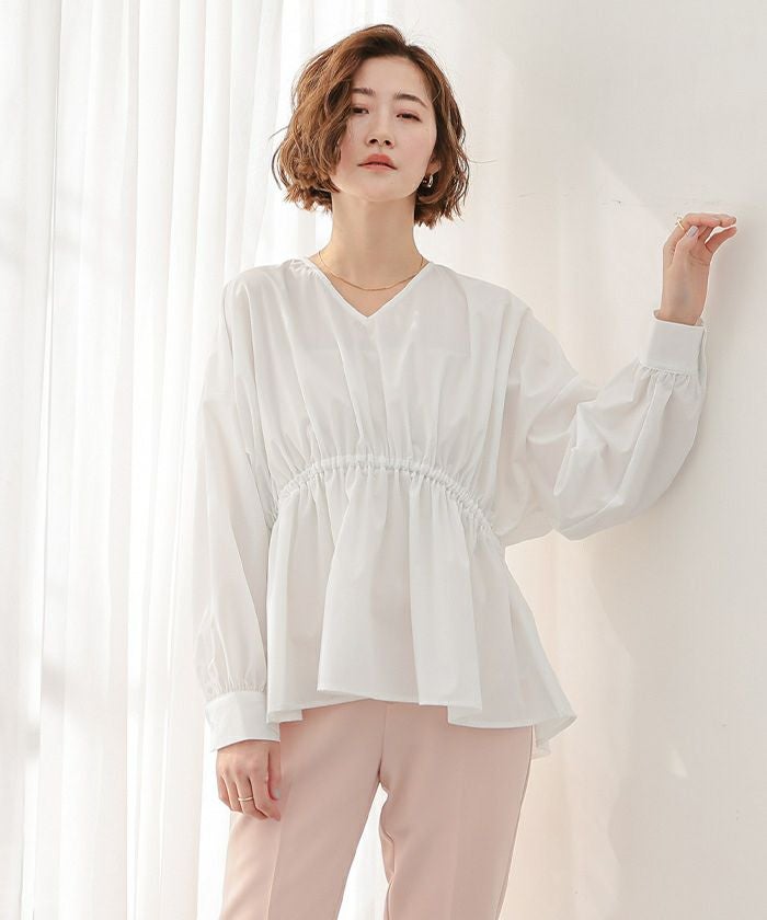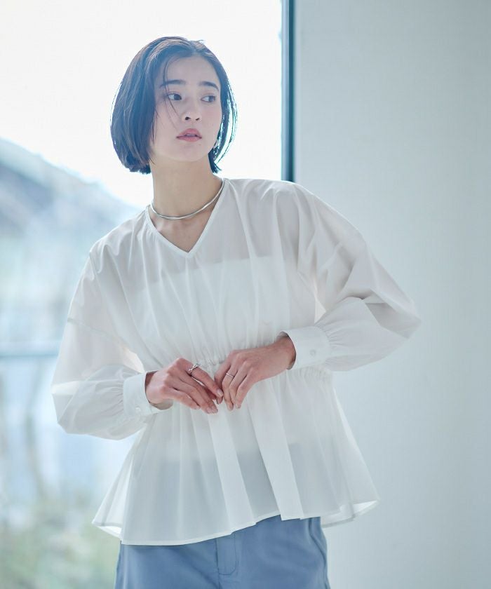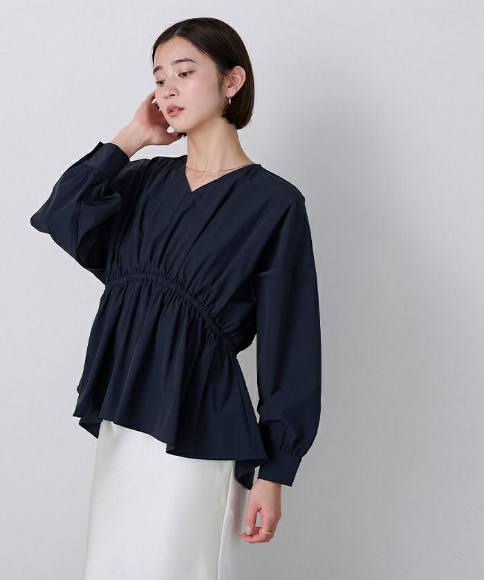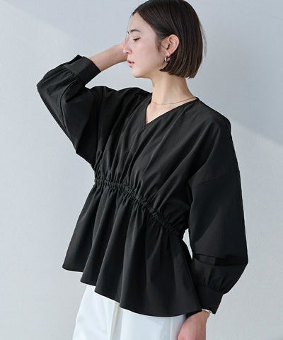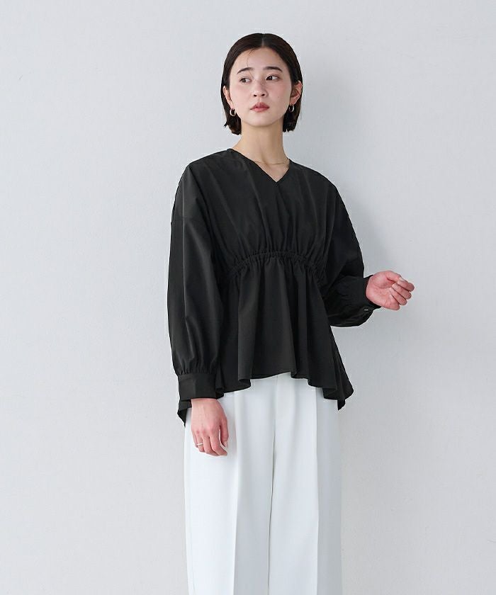 Vネックで顔まわりをすっきり見せてくれるブラウスです。