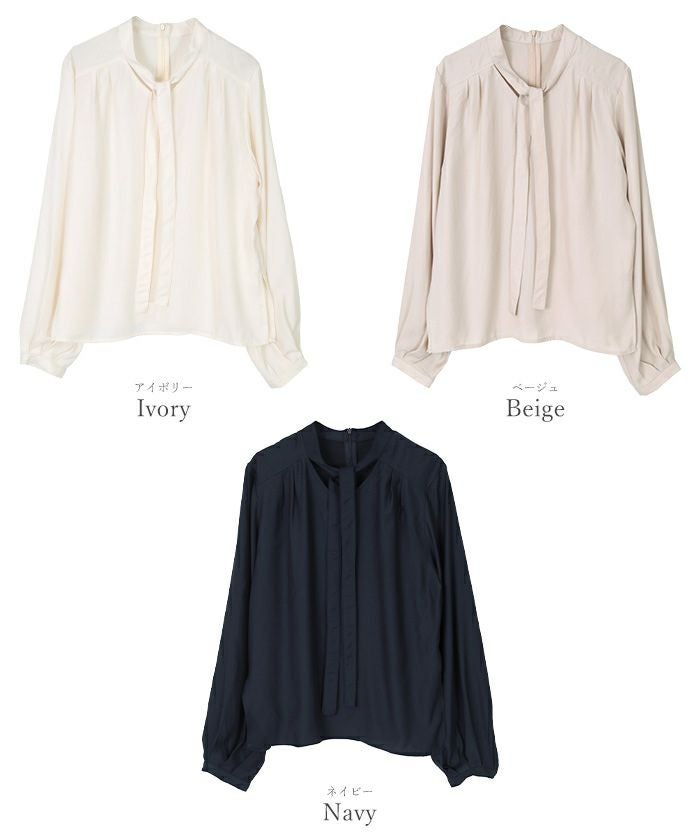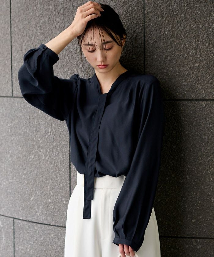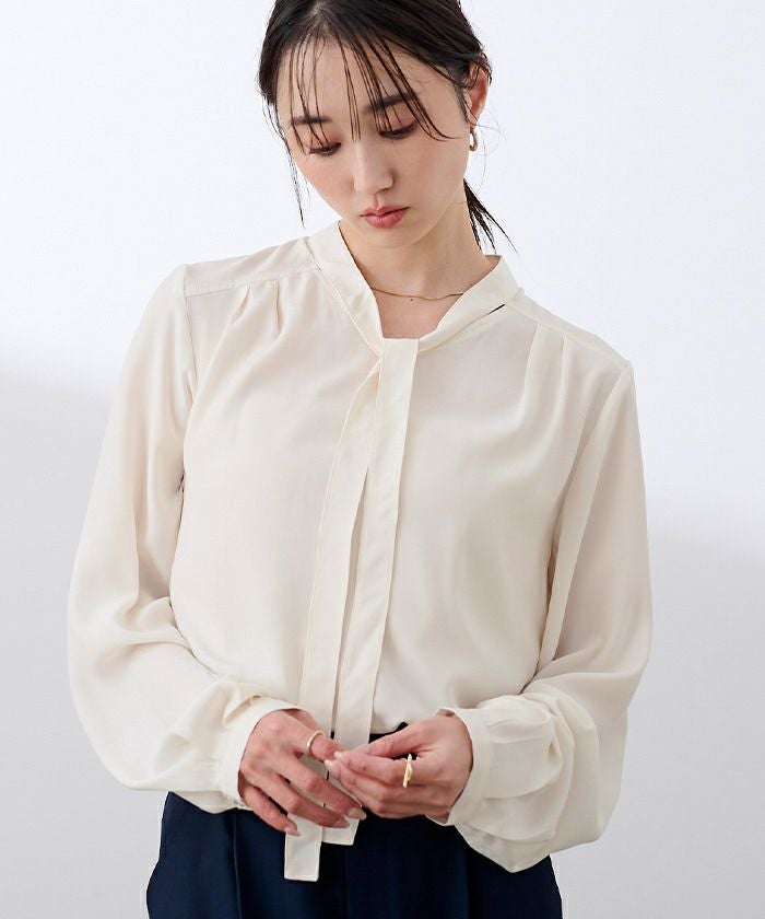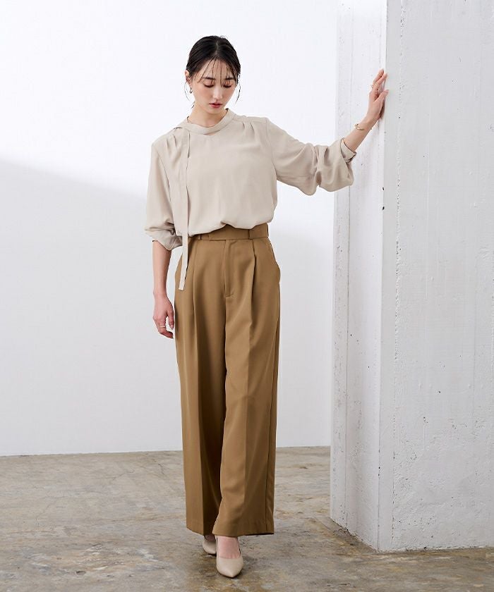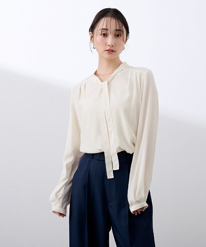 肩に入れたタックと、落ち感のあるシルエットが女性らしい印象のブラウスです。