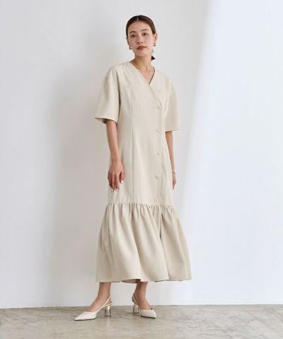 ノーカラーVネックティアードワンピース