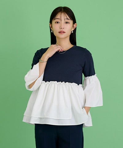 ネイビー・Mサイズを購入。 青すぎず黒寄りの紺。 バイカラーが珍しくて被らない可愛さ。 届いて気づいたけどフリルも切り替えで2重になっていて甘すぎずオシャレ。 ネイビー部分がニット素材で、伸縮性があり着心地よく、厚くないので春秋にピッタリ。 袖も手首までフリルがあると作業時に広がって邪魔になるけど、障害のないちょうどいい袖丈。 フリルは配送時にシワになっていることが多いけど、これはシワがなかった。 クオリティに感動。