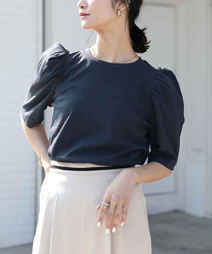 カットソー素材でサラッときやすいけれど、パフスリーブのおかげでカジュアルすぎず、オフィスでもぴったりです。