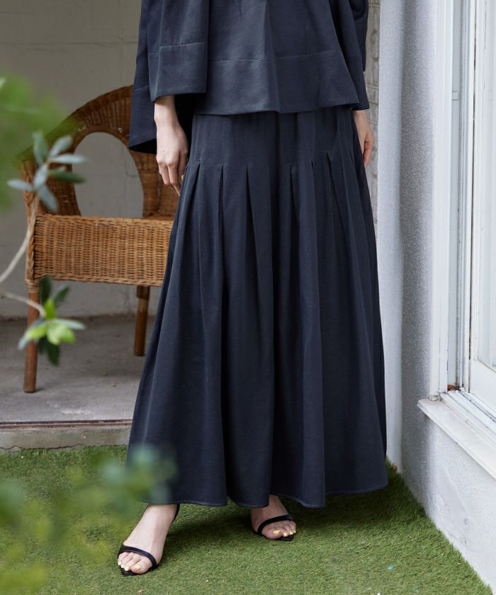 たっぷり生地を使っており、揺れ感がステキでテンションの上がるスカートです。腰回り下からのプリーツなので、スッキリ見えて落ち感もあるので大きく見え過ぎることもなく履けます。トップスとセットアップで合わせるのがとてもステキですが、シンプルなカットソーやTシャツ合わせでも着映えするので、色んなコーデをしたいです。デニム見えする生地が程よくカジュアルなので、気軽に履けそうです。 -