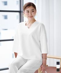 ほどよい開き具合で鎖骨がキレイに見えます。タイトめなのでボトムスはワイドパンツに合わせてとても素敵です!